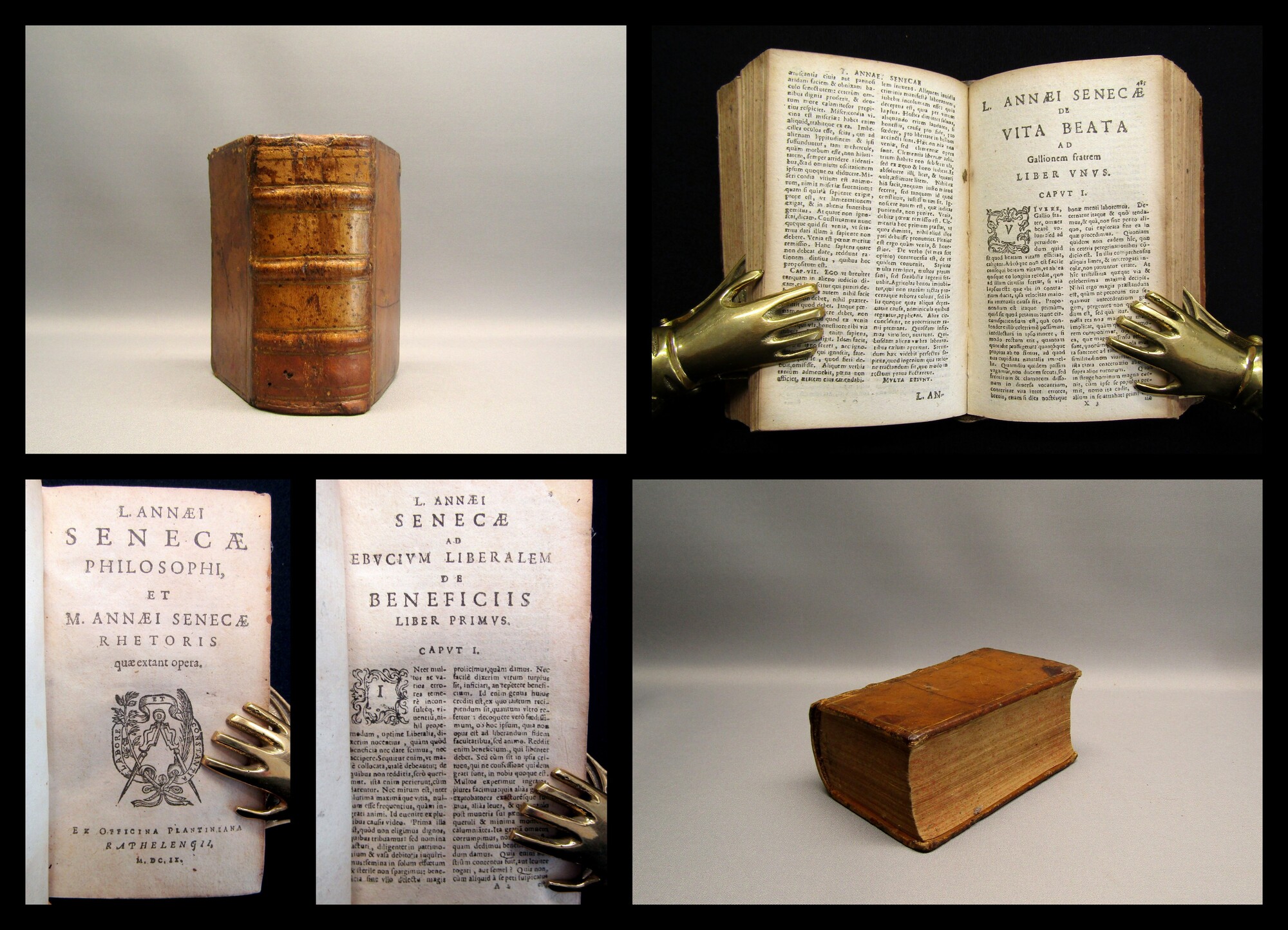 Seneca, Lucius Annaeus. L. Annaei Senecae Philosophi et M. Annaei Senecae Rhetoris quae extant opera. Leiden, Plantin Press (F. Raphelengii), 1609. 12° (12,5x7,5cm), 980 S., Ldr. d. Zt. Sehr seltene Taschenausgabe der Werke Senecas (ohne Tragödien). Lucius Annaeus Seneca, genannt Seneca der Jüngere, war ein römischer Philosoph, Dramatiker, Naturforscher, Politiker und als Stoiker einer der meistgelesenen Schriftsteller seiner Zeit. - Einband etwas berieben, beschabt und bestoßen. Papier gebräunt und teils braunfleckig. Insgesamt gutes Exemplar. Bestell-Nr: 13-0-77..........verkauft | ![]() | |