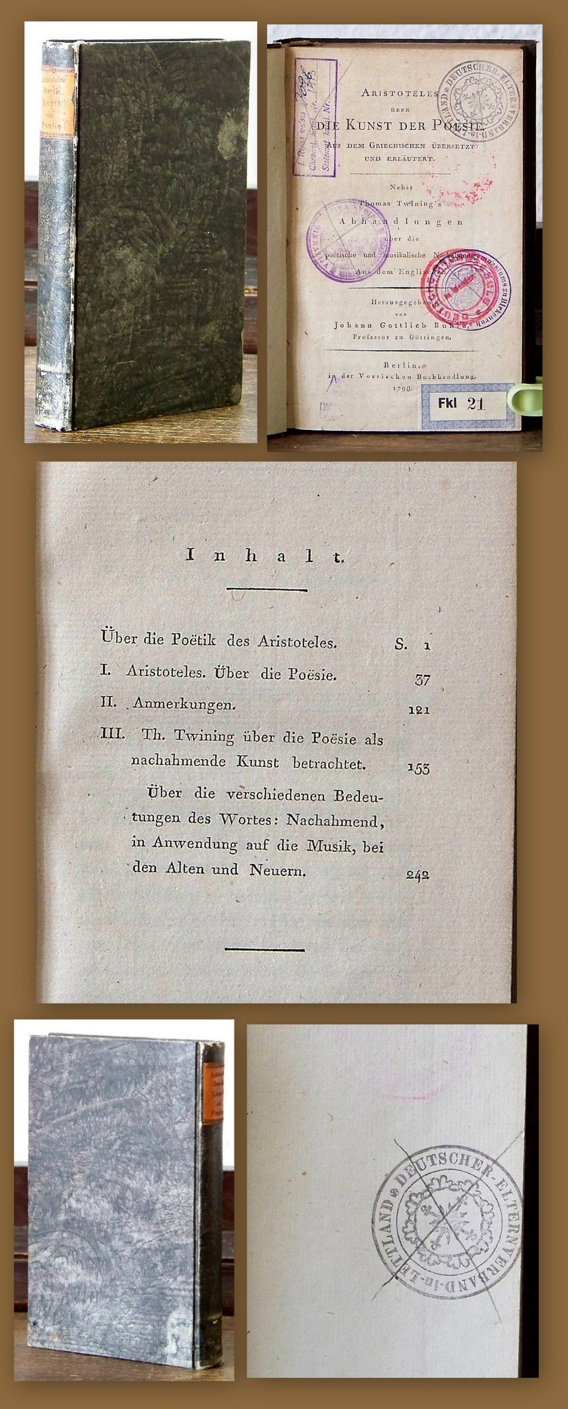Buhle, Johann Gottlieb. Aristoteles über die Kunst der Poesie. Aus dem Griechischen übersetzt und erläutert. Nebst Thomas Twining's Abhandlungen über die poetische und musikalische Nachahmung. Aus dem Englischen. Berlin, Vossische Buchhandlung, 1798. 8°. VIII., 1 nn. Bl., 278 S., Pp. d. Zt. mit Rsch. Aristoteles' Fragment über die Dichtkunst und die Theorie der Poesie und vergleichend dazu eine Abhandlung von Thomas Twining, der die Poesie als eine nachahmende Kunst betrachtet. Pp. d. Zt. minimal bestoßen. Vorsatz und Titel mit Bibliotheksstempeln und -aufkleber versehen. Seiten minimal gebräunt und sauber. Sehr gutes Exemplar. Bestell-Nr: 13-0-4..........verkauft | ![]() | |