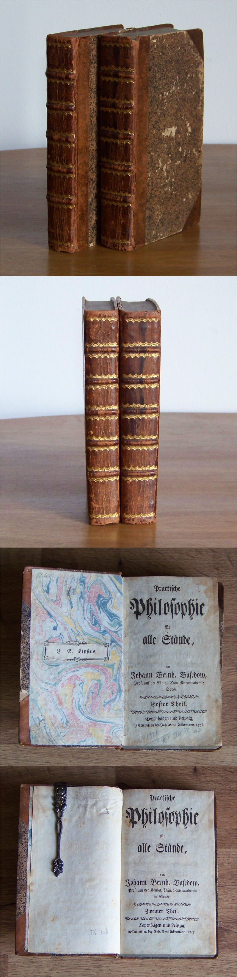 Basedow, Johann Bernhard. Practische Philosophie für alle Stände. 2 Tle. in 2 Bd. Copenhagen und Leipzig, J. B. Ackermann, 1758. 8°, 8 nn. Bll., S. 1-576; S. 577-1034, 31 nn. Bll., HLdr. d. Zt. SBB - Np 3584 - Erste Ausgabe. Einbande etwas berieben und bestossen. Papier altersbedingt durchgehend etwas gebräunt. Weisser Vorsatz von Band 1 fehlend. Spiegel je mit altem Exlibris von J. G. Lipsius. Vorsatz von Band 2 mit altem hs. Besitzeintrag. Gutes Exemplar dieses seltenen Titels. Bestell-Nr: 13-0-3..........verkauft | ![]() | |