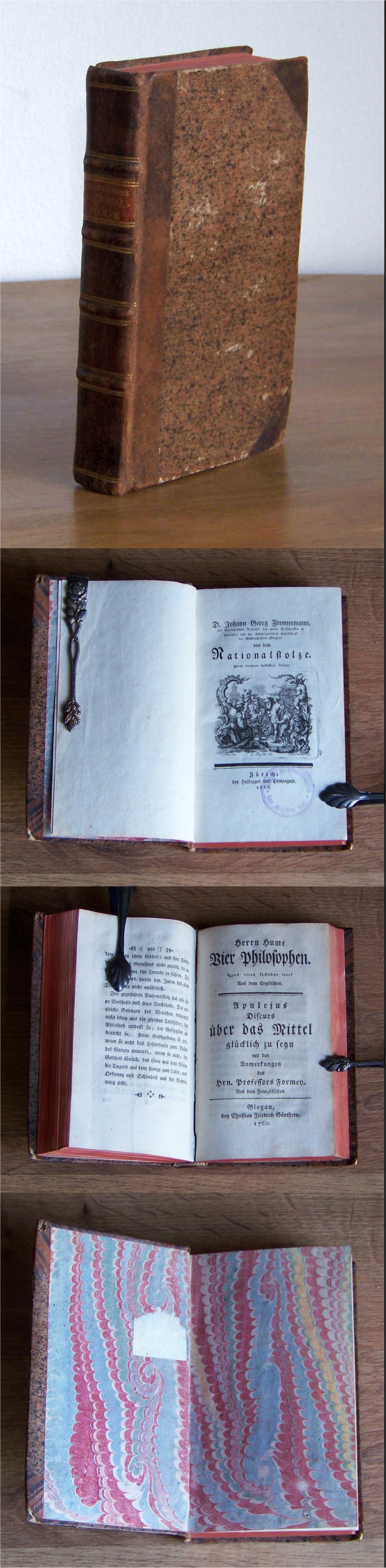 Sammelband Philosophie - Zimmermann, D. Johann, Georg / Hume, David. I) Von dem Nationalstolze. 2. A. II) Herrn Hume Vier Philosophen. aus dem Englischen. Apulejus Discurs über das Mittel glücklich zu seyn mit den Anmerkungen des Herrn Professors Formey. Aus dem Französischen. I) Zürich, II) Glogau, I) Heidegger und Compagnie, II) Christian Friedrich Günther, beide 1760. 8°, mit gest. Titelvignette, 1 nn. Bll., VIII, 226 S.; 143(1) S., 1 nn. Bll., HLdr. d. Zt. mit Rs. II) in erster Dt. Ausgabe. Einband Einband etwas berieben, kaum bestossen. Papier sehr sauber und frisch. Titel und Vorrede von I) mit altem Bibliotheksstempel. Gutes Exemplar der seltenen Titel. Bestell-Nr: 13-0-2..........verkauft | ![]() | |