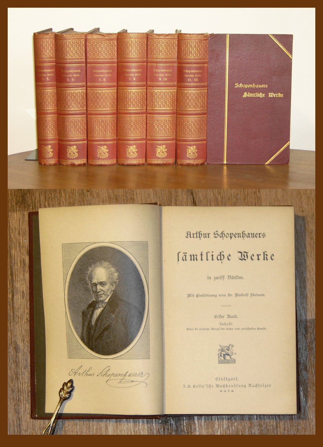 Schopenhauer, Arthur / Steiner, Dr. Rudolf. Sämtliche Werke in zwölf Bänden (6 Bücher). Stuttgart, J. G. Cottasche Buchhandlung, o. J. (um 1890). 8°, mit Portrait Schopenhauers in Bd. 1, zus. ca. 3560 S., OLn. Gesamtausgabe der Werke Schopenhauers. Leineneinbände in Lederoptik etwas berieben, kaum bestossen, Rücken leicht aufgehellt. Vorderes Innengelenk von Band 9 etwas gelockert. Papierbedingt gering gebräunt. Saubere, gute Exemplare. Bestell-Nr: 13-0-5..........verkauft | ![]() | |