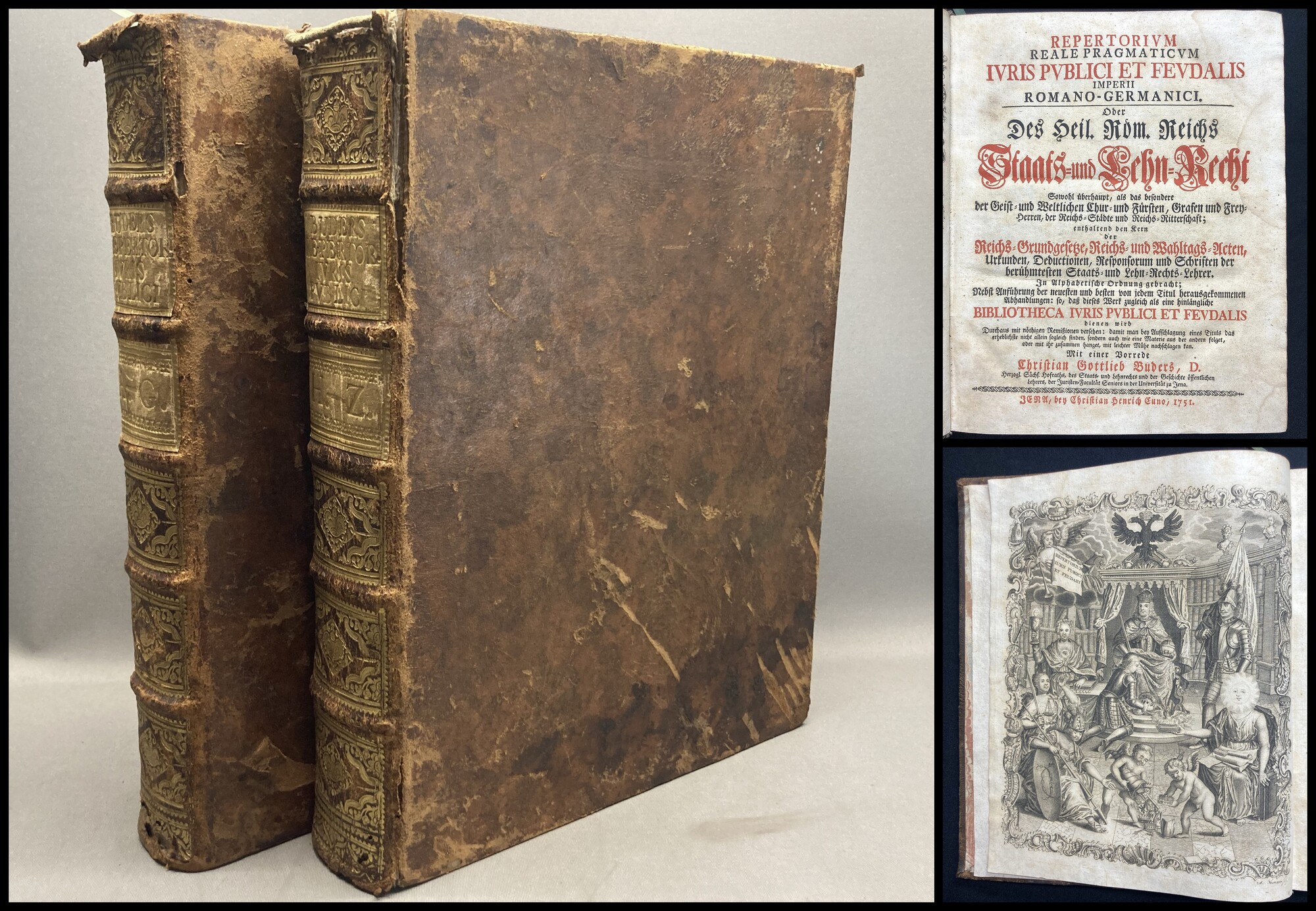 Buders, Christian Gottlieb. Repertorium Reale Pragmaticum Iuris Publici et Feudalis Imperii Romano-Germanici. Oder Des Heil. Röm. Reichs Staats- und Lehn-Recht. Sowohl überhaupt, als das besondere der Geist- und Weltlichen Chur- und Fürsten, Grafen und Frey-Herren, der Reichs-Städte und Reichs-Ritterschaft [...] 2 Bände A-Z. Jena, Cuno, 1751. 4° (27,5x22cm), mit gestochenen Frontispiz, einigen Textkupfern und Schmuckvignetten, 7 nn. Bll., 536 S.; [2] S., S. 539-1276, Lederbände d. Zt. mit Rückenvergoldung. Wichtiges Nachschlagewerk zu den damals geltenden Rechtsbestimmungen und Gesetzen, Der Halsgerichtsordnung etc. - Einbände berieben, bestoßen und beschabt, Gelenke etwas brüchig, oberflächig teils gering wurmspurig. Papier etwas gebräunt, teils etwas braunfleckig. Band 1 zu Beginn (ca. erste 25 Blatt) etwas feuchtrandig, sowie im unteren Schnitt mit altem Tintenfleck (leicht in den Block hinenziehend).. Bestell-Nr: 14-0-96..........400,00 € (inkl. MwSt. zzgl. Versand) | ||