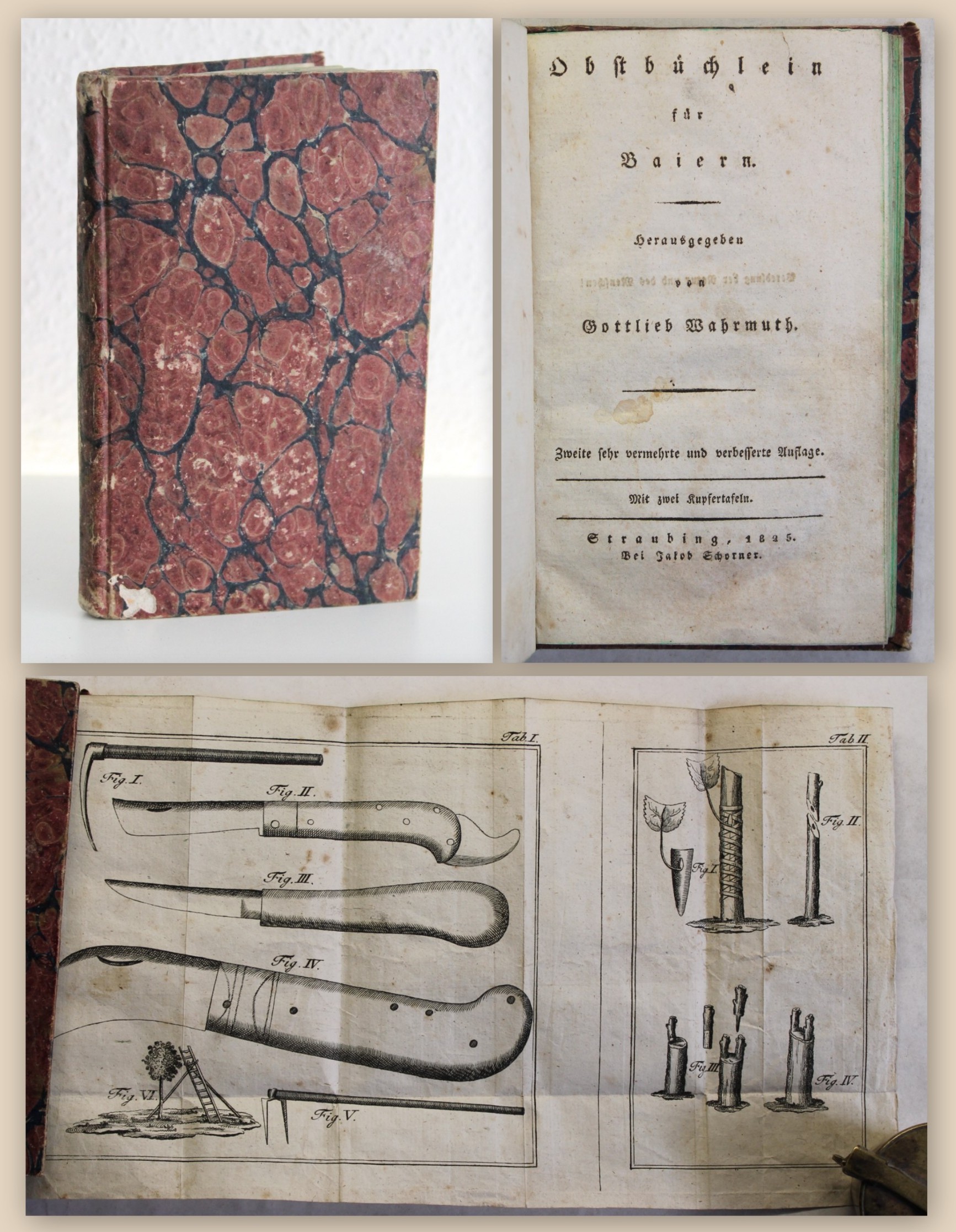 Wahrmuth, Gottlieb. Obstbüchlein für Baiern. Zweite sehr vermehrte und verbesserte Auflage. Straubing, Jakob Schorner, 1825. Kl.-8°, Mit 10 Abb. auf 2 Kupfertaf. (auf 1 mehrfach gefalt. Bl.), 126 S., 1 Bl., Pp. d. Zt. Enthalen u. a.: Ueber den Anbau der Obstkerne, Edelschule, Veredelungsarten, von Krankheiten und den Feinden der Obstbäume. Pappband leicht berieben und bestoßen. Papier etwas fleckig und angestaubt, Widmung von alter Hand auf Vorsatz. Gutes Exemplar. Bestell-Nr: 15-0-40..........verkauft | ||
