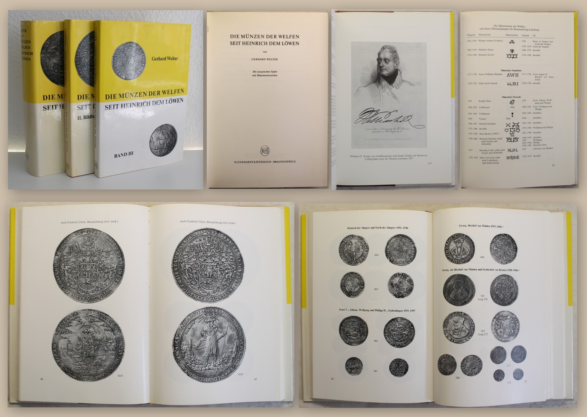 Welter, Gerhard. Die Münzen der Welfen seit Heinrich dem Löwen. Mit synoptischen Tafeln und Münzmeisterzeichen. Braunschweig, Klinkhardt u. Biermann, 1971 - 1978. 4°, mit zahlr. Tafeln und Abb., XI, 543 S., 2 Bl.; IX, 49 S., 1 Bl., 269 .S, 1Bl.; VII, 235 S. OKldr. mit SU. Umfangreiche Ausarbeitung und Standardwerk zu Thema "Münzen der Welfen". Schutzumschlag mit minimalen Gebrauchsspuren sonst sauber. Sehr schönes Exemplar. Bestell-Nr: 20-0-10..........verkauft | ![]() |