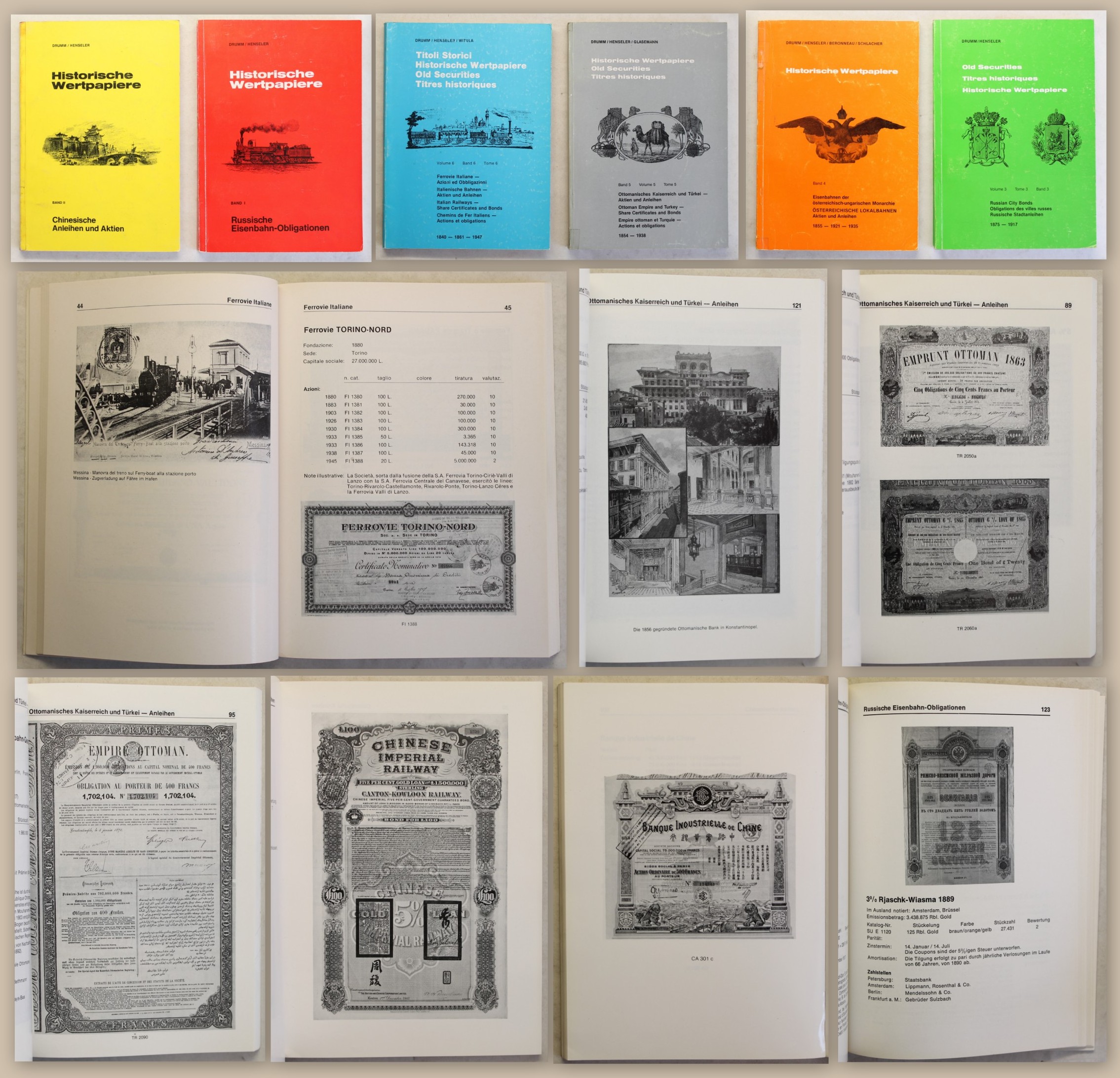 Drumm / Henseler / Beronneau / Schlacher / Witula / Glasemann. Historische Wertpapiere - Band 1-6. Frankfurt am Main, Selbstverlag, 1975 - 1986. 8°, mit eigenhändiger Signatur der Hauptherausgeber in Bd. 1, zus. ca. 1200 S., OBrosch. Umfassende, großzügig illustrierte Reihe. Beinhaltet: Band 1- Russische Eisenbahn-Obligationen, Band 2- Chinesische Anleihen und Aktien, Band 3- Russische Staatsanleihen, Band 4- Österreichische Lokalbahnen Anleihen und Aktien, Band 5- Ottomanisches Kaiserreich und Türkei Anleihen und Aktien, Band 6- Italienische Bahnen Anleihen und Aktien. Broschuren mit Gebrauchsspuren, Rücken z.T. mit Tesa verstärkt. Papier Sauebr. Gute Exemplare. Bestell-Nr: 20-0-24..........verkauft | ![]() | |