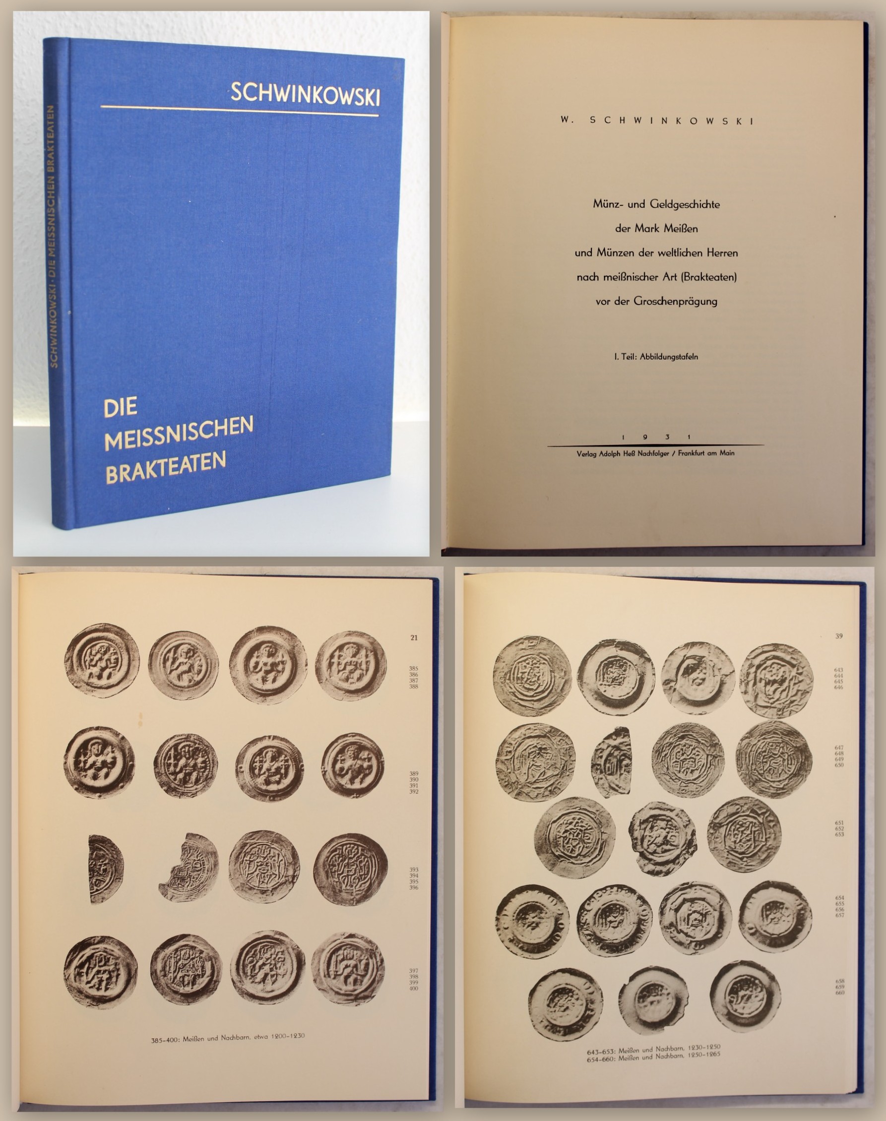 Schwinkowski, W. Münz- und Geldgeschichte der Mark Meißen und Münzen der weltlichen Herren nach meißnischer Art (Brakteaten) vor der Groschenprägung - 1. Teil: Abbildungstafeln. Frankfurt am Main, Adolph Heß Nachfolger, 1931 (ND 1976). 4°, mit ca. 1100 Abbildungen auf 63 Tafeln, 2 Bll., 4 S., OLn. Photomechanischer Nachdruck des Zentralantiquariat der Deutschen Demokratischen Republik, der seltenen Ausgabe 1931. Sauberes, nahezu verlagsfrisches Exemplar des selbst als Neudruck seltenen und gesuchten Titels. Bestell-Nr: 20-0-36..........verkauft | ![]() | |