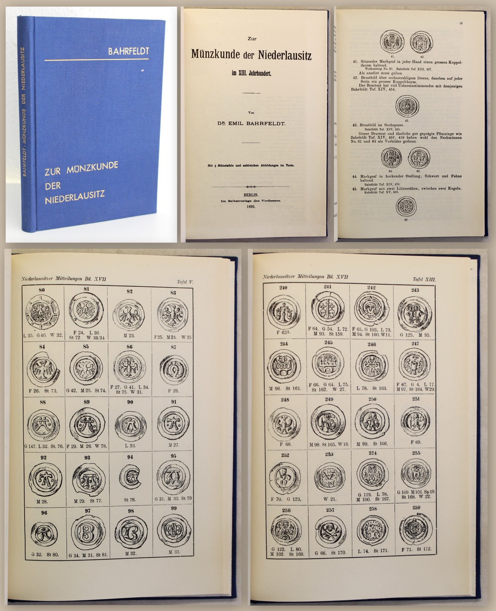 Bahrfeldt, Dr. Emil. Zur Münzkunde der Niederlausitz im XIII. Jahrhundert, angeb. ders.: Niederlausitzer Mitteilungen - 1926 - Zweite Hälfte. Berlin, Selbstverlag, 1892 (ND 1980). 8°, mit zusammen 25 Münztafeln und zahlreichen Textabbildungen, 41 S.; S. 137-259, OLn. Photomechanischer Nachdruck des Zentralantiquariat der Deutschen Demokratischen Republik, zweier seltenen Ausgaben. Sehr gutes Exemplar in nahezu verlagsfrischer Erhaltung der selbst als Neudrucke seltenen und gesuchten Titel. Bestell-Nr: 20-0-38..........verkauft | ![]() | |