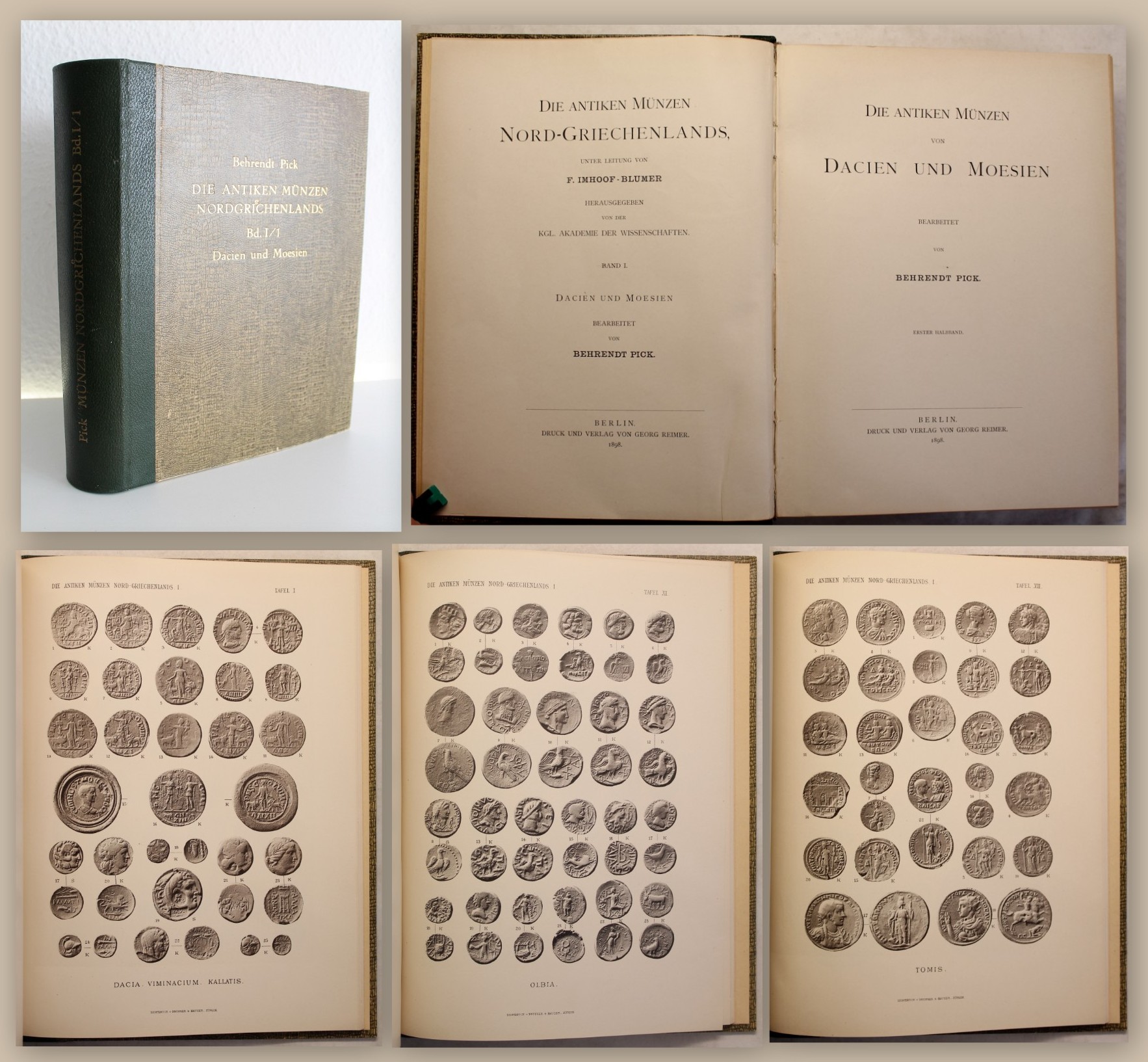 Pick, Behrendt. Die antiken Münzen von Dacien und Moesien - Erster Halbband. Berlin, Georg Reimer, 1898. 4°, mit ca. 800 Abbildungen auf 20 Tafeln, XV, 518 S., 2 nn. Bll., spät. HLdr. mit Deckelbezügen in Krokodillederoptik. Erste Ausgabe. Bildet zugleich den in sich geschlossenen Band I/I: aus der Reihe "Die antiken Münzen Nord-Griechenlands". Einband gering berieben. Papier minimalst gebräunt. Sauberes, gutes Exemplar des seltenen Titels. Bestell-Nr: 20-0-7..........verkauft | ![]() | |