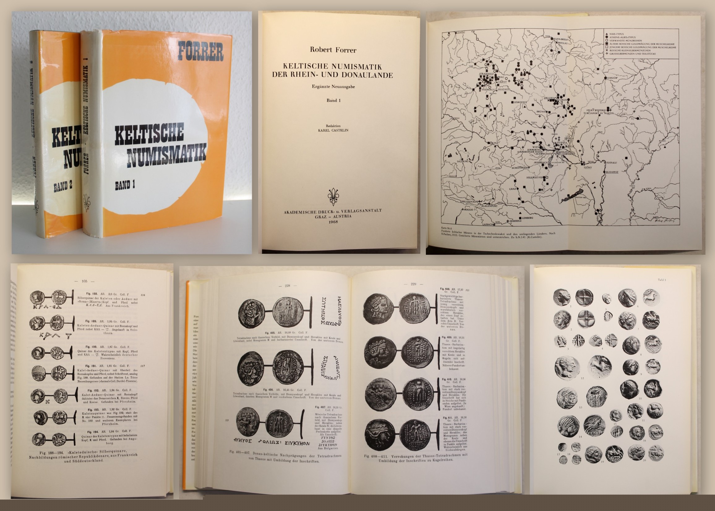 Forrer, Robert. Keltische Numismatik der Rhein- und Donaulande. Ergänzte Neuausgabe in 2 Bd. komplett. Graz - Astria, Akademische Druck- und Verlagsanstalt, 1968 - 1969. Gr.-8°, mit 68 Tafeln und zahlr. Abb. im Text, 373 S, 1 Bl.; 245 S., OLn. mit SU. Schutzumschläge mit leichten Gebrauchsspuren, Einbände frisch, Stempel auf beiden Vorsätzen. Gutes Exemplar. Bestell-Nr: 20-0-8..........verkauft | ![]() | |