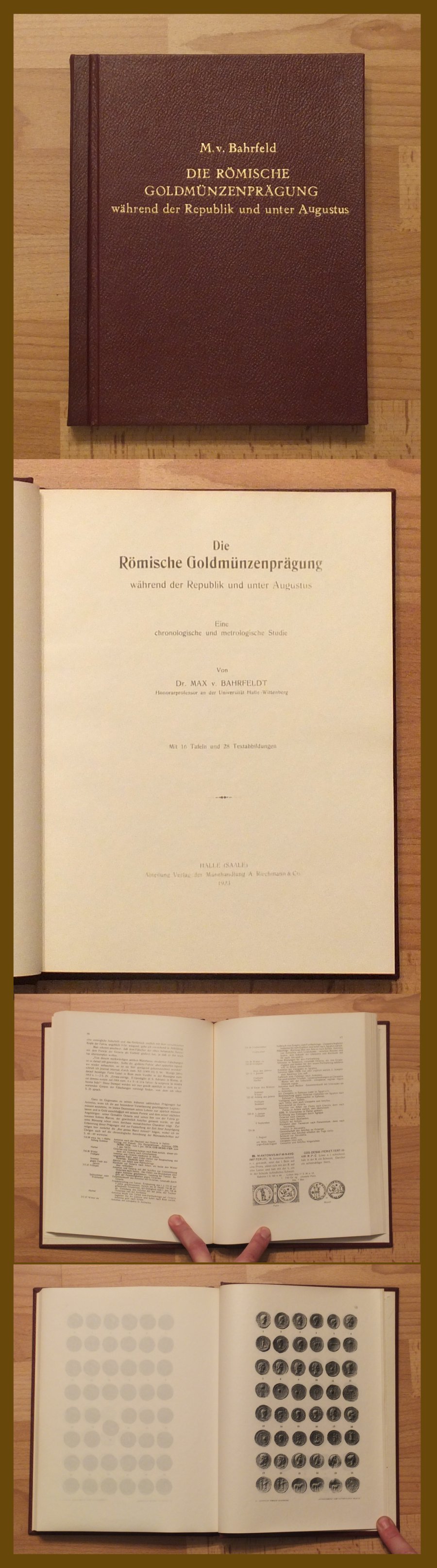 Bahrfeldt, Dr. M. v. Die Römische Goldmünzenprägung während der Republik und unter Augustus - Eine chronologische und metrologische Studie. Halle (Saale), Abteilung Verlag der Münzhandlung A. Riechmann & Co., 1923. 4°, mit 16 Tafeln und 28 Textabbildungen, 2 nn. Bll., XVI, 208 S., Ln. Privater, photomechanischer Nachdruck, wohl um 1980, der seltenen Ausgabe 1923. Das Original erschien als Band I der Reihe "Münzstudien" unter Schriftleitung von Bahrfeld und Buchenau. Einband kaum gebrauchsspurig, Papier sauber und frisch. Sehr gutes Exemplar des selbst als Neudruck seltenen Titels. Bestell-Nr: 20-0-5..........verkauft | ![]() | |