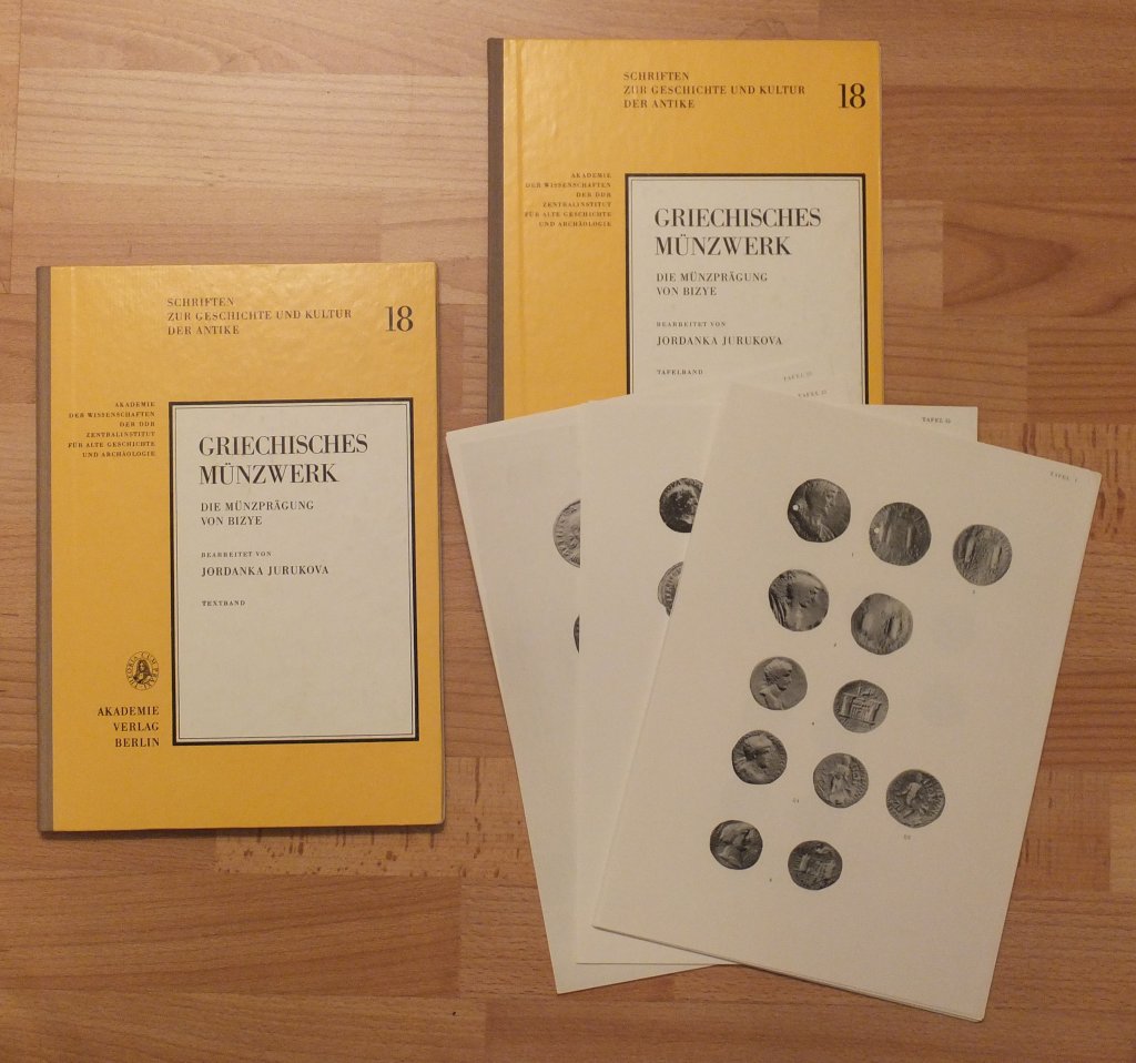 Jurukova, Jordanka. Griechisches Münzwerk - Die Münzprägung von Bizye. 2 Bände (Text + Tafeln). Berlin, Akademie Verlag, 1981. gr. 4°, mit ca. 250 Abbildungen auf 29 + IV Tafeln, V, 94 S., OHLn. Erste Ausgabe. Zugleich Band 18 der Reihe "Schriften zur Geschichte und Kultur der Antike", herausgegeben von der Deutschen Akademie der Wissenschaften zu Berlin - Zentralinstitut für alte Geschichte und Archäologie. Einband mit geringen Gebrauchsspuren. Papier sauber und fleckenfrei. Sehr gutes Exemplar. Bestell-Nr: 20-0-3..........verkauft | ![]() | |