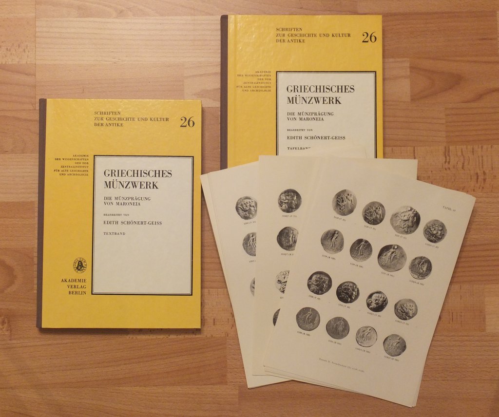 Schönert-Geiss, Edith. Griechisches Münzwerk - Die Münzprägung von Maroneia. 2 Bände (Text + Tafeln). Berlin, Akademie Verlag, 1987. gr. 4°, mit ca. 1800 Abbildungen auf 94 Tafeln, V, 253 S., OHLn. Erste Ausgabe. Zugleich Band 26 der Reihe "Schriften zur Geschichte und Kultur der Antike", herausgegeben von der Deutschen Akademie der Wissenschaften zu Berlin - Zentralinstitut für alte Geschichte und Archäologie. Einband mit geringen Gebrauchsspuren. Papier sauber und fleckenfrei. Sehr gutes Exemplar. Bestell-Nr: 20-0-1..........verkauft | ![]() | |