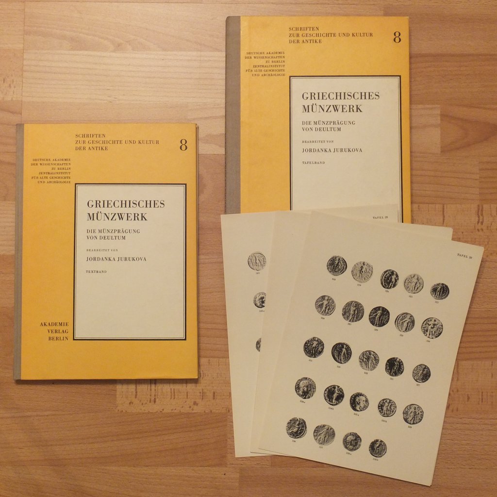 Jurukova, Jordanka. Griechisches Münzwerk - Die Münzprägung von Deultum. 2 Bände (Text + Tafeln). Berlin, Akademie Verlag, 1973. gr. 4°, mit ca. 550 Abbildungen auf 32 Tafeln, V, 169(1) S., OHLn. Erste Ausgabe. Zugleich Band 8 der Reihe "Schriften zur Geschichte und Kultur der Antike", herausgegeben von der Deutschen Akademie der Wissenschaften zu Berlin - Zentralinstitut für alte Geschichte und Archäologie. Einband mit geringen Gebrauchsspuren. Papier sauber und fleckenfrei. Sehr gutes Exemplar. Bestell-Nr: 20-0-2..........verkauft | ![]() | |