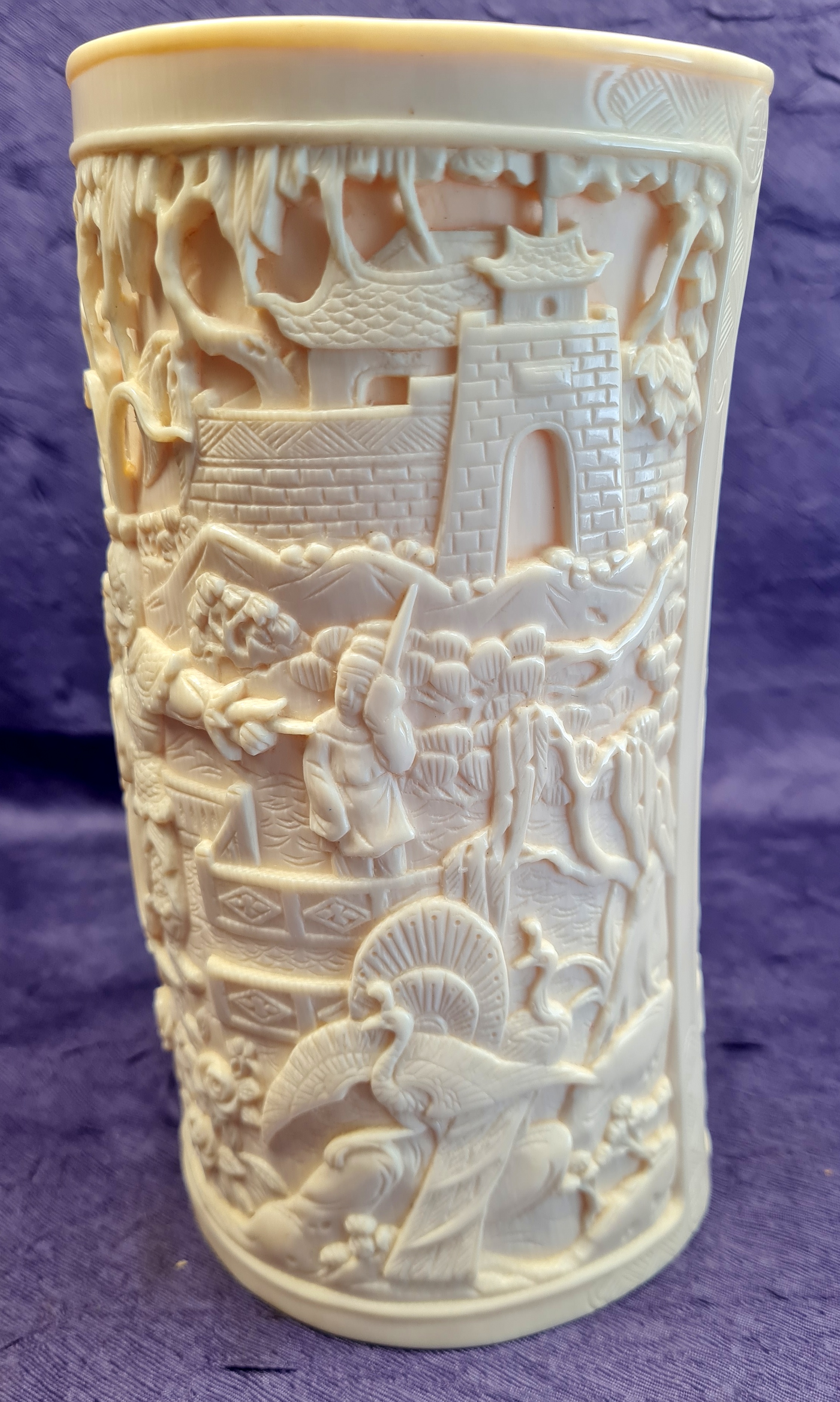 Asiatika - China. Pinselbecher. , , um 1900. Höhe ca. 19 cm; Bein, geschnitzt. Zwei Schuauseiten mit vielfigurigen Szenen vor Architekturlandschaft. 1. Seite: Teezeremonie mit musikalischer Begleitung an Lotusblütenteich. 2.Seite: Krieger im Rosengarten mit Pfauen. Nahezu ohne Gebrauchsspuren, Sehr schönes Exemplar.. Bestell-Nr: 24-0-6..........verkauft | ![]() | |