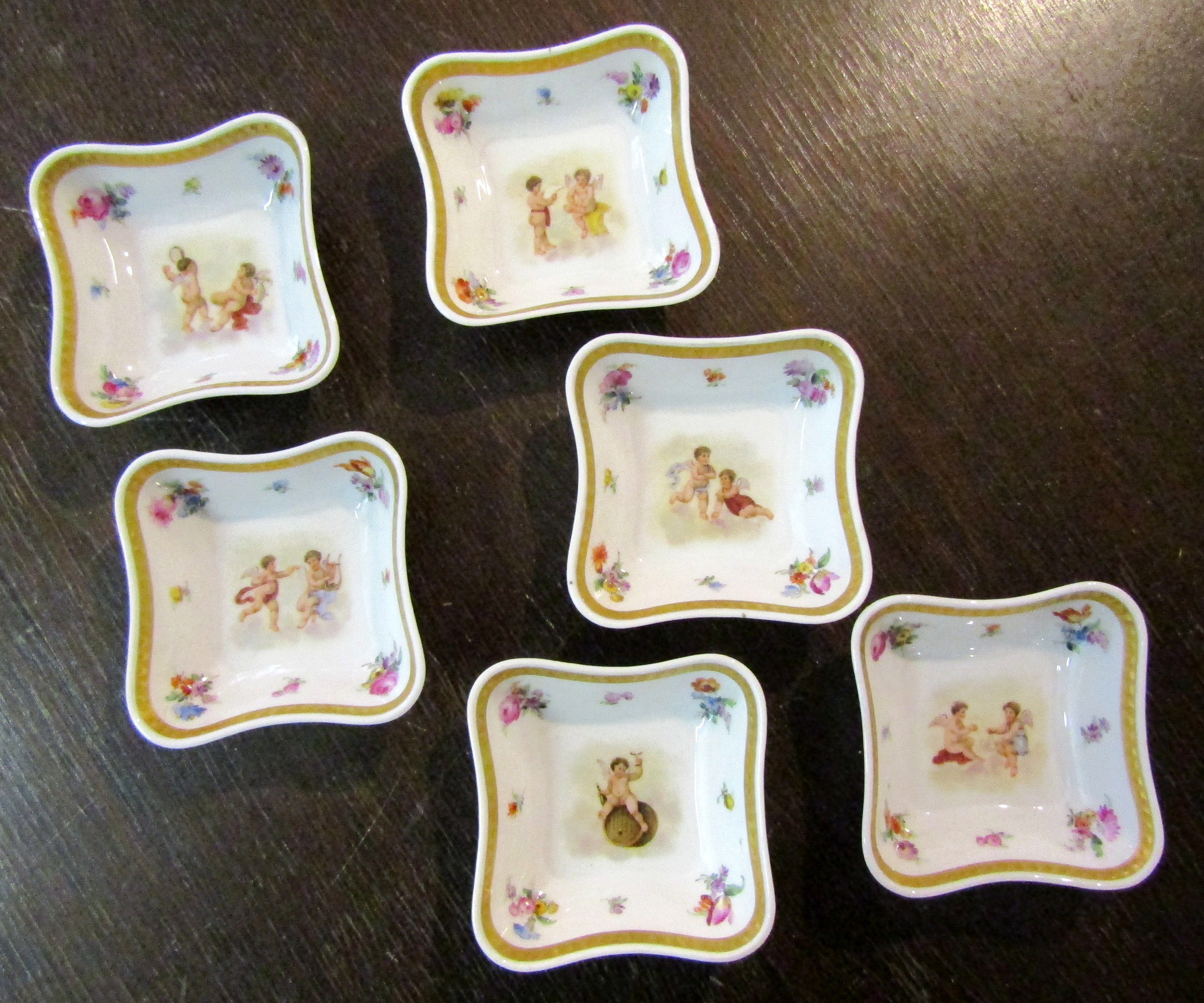 . Prächtiges - Hausmaler - Service für 6 Personen. 22 teilig.. Schlesien, Ausformung Porzellanmanufaktur Ohme, um 1920. je mit annähernd spiegelfüllenden, jeweils individuellen Motiven von Putti als Allegorien, die Ränder mit Streublumen und duftigen Sträußen. Eine Platte als Mittelstück mit aufwändiger Malerei der Venus umgeben von Putti.; die prachtvolle Bemalung durch einen Hausmaler.; Weißporzellan, polychrome Aufglasurmalerei und Goldrand.; Unterseitig je auf aufglasurblauem Rechteck in Gold gemarkt H.E. (je die Manufakturmarke Ohme verdeckend); die Platte signiert G. Opitz. Aufgrund der nicht nachzuweisenden, ungewöhnlichen Blaumarke auf der Unterseite in Aufglasur, unter der teils die Manufakturmarke der schlesischen Porzellanfabrik Ohme (1882-1930), diese Marke (ab 1920) durchschimmert, ist anzunehmen, dass es sich um das Werk eines begabten Hausmalers handelt. Die Qualität der Malerei und Beherrschung der Farben spricht dafür, dass er die fundierte Ausbildung in einer größeren Manufaktur erhalten hat. Enthält 22 Teile je mit Motivmalerei: 1 Vorlegeplatte, 2 große Schalen, 6 kleine Schälchen, 6 flache Teller, 6 tiefe teller, 1 Sauciere. Strahlender Erhaltungszustand der Farben, die Goldränder partiell mit schwachem Abrieb. Das Porzellan teils mit Eisenflecken im Randbereich.. Bestell-Nr: 24-0-9..........verkauft | ![]() | |