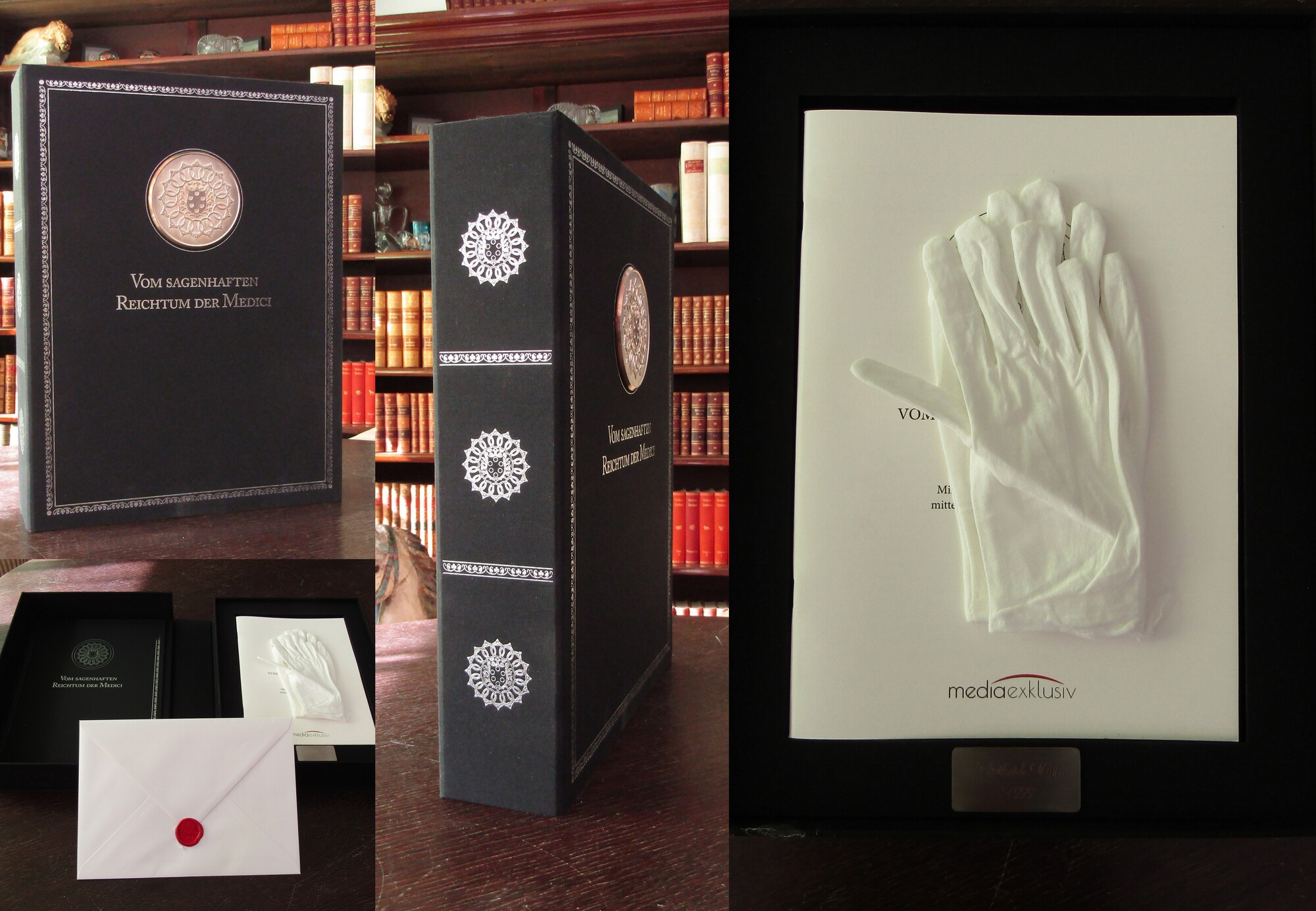 Media Exklusiv 2021. Vom Sagenhaften Reichtum der Medici 1 v. 999 Exemplaren Dieses trägt die Nr.3, Mit 20 Tafeln und und Beiheft, jedoch ohne die dazugehörige Silbermünze. Gütersloh, Media Exklusiv, 2021. 2° Folio (ca. 40 x 30 cm),- Titel, Beiheft, Handschuhe, 20 Tafeln,- Leinenmappe mit dem Familienwappen auf der Kassette. - - 1 v. 999 Exemplaren, dieses ist Nr.3,- Mit Beiheft und 20 Tafeln,- jedoch ohne die dazu gehörige Silbermünze. Bestell-Nr: 25-0-12..........180,00 € (inkl. MwSt. zzgl. Versand) | ||