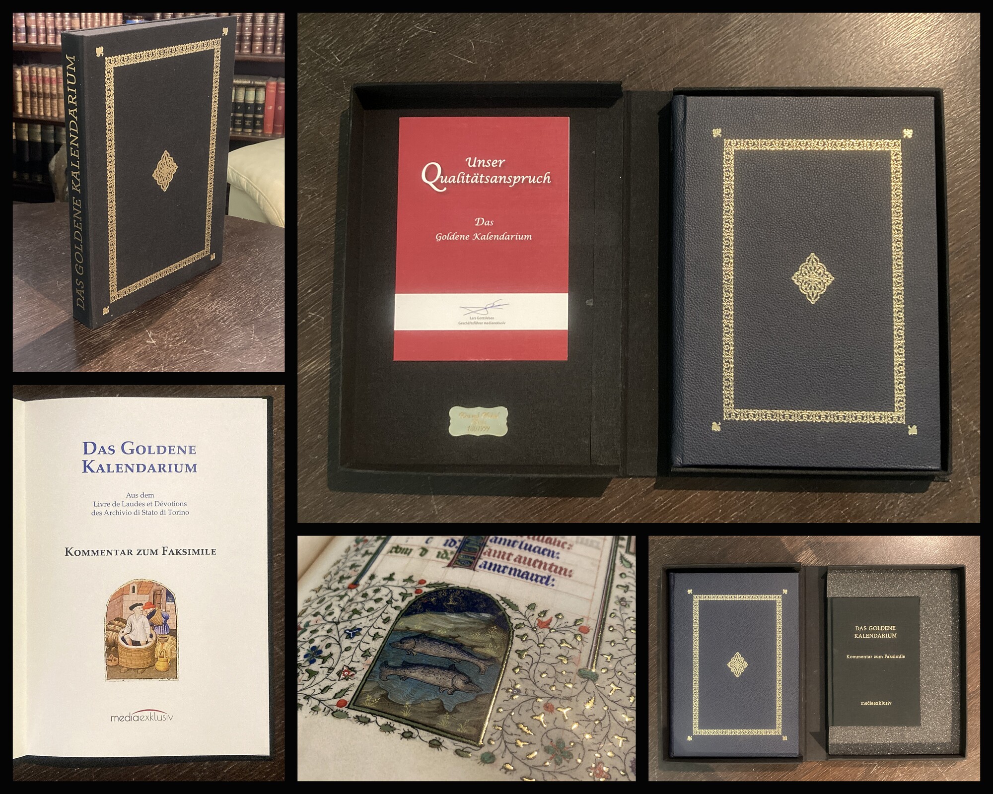 . Das goldene Kalendarium. Faksimile der Handschrift JB.II21bis aus dem Livrre de Laudes et Dévotions des Archivio di Stato di Torino.. Gütersloh, Media Exclusiv, 2019. gr. 4°, mit 24 Miniaturen in goldgehöhten Bordüren aus Rankenwerk u. tls. goldgehöhtem Text, 3 (w) Bll., 12 Bll., 3(WBll.; 60 S. (Kommentarband, dunkelblaues genarbtes Ldr. mit dreis. Goldschnitt, goldgepr. Mittelstück u. ornamentalen Fileten u. OLwd. mit goldgepr. Titel in goldgepr. Lwd.-Kassette mit goldgepr. RTitel. 1 von 999 nummer. Exemplaren. - 12 Kalenderblätter mit je 2 von der flämischen Buchmalerei beeinflussten Miniaturen. - Gesamt in sehr guter Zustand.. Bestell-Nr: 25-0-17..........verkauft | ||