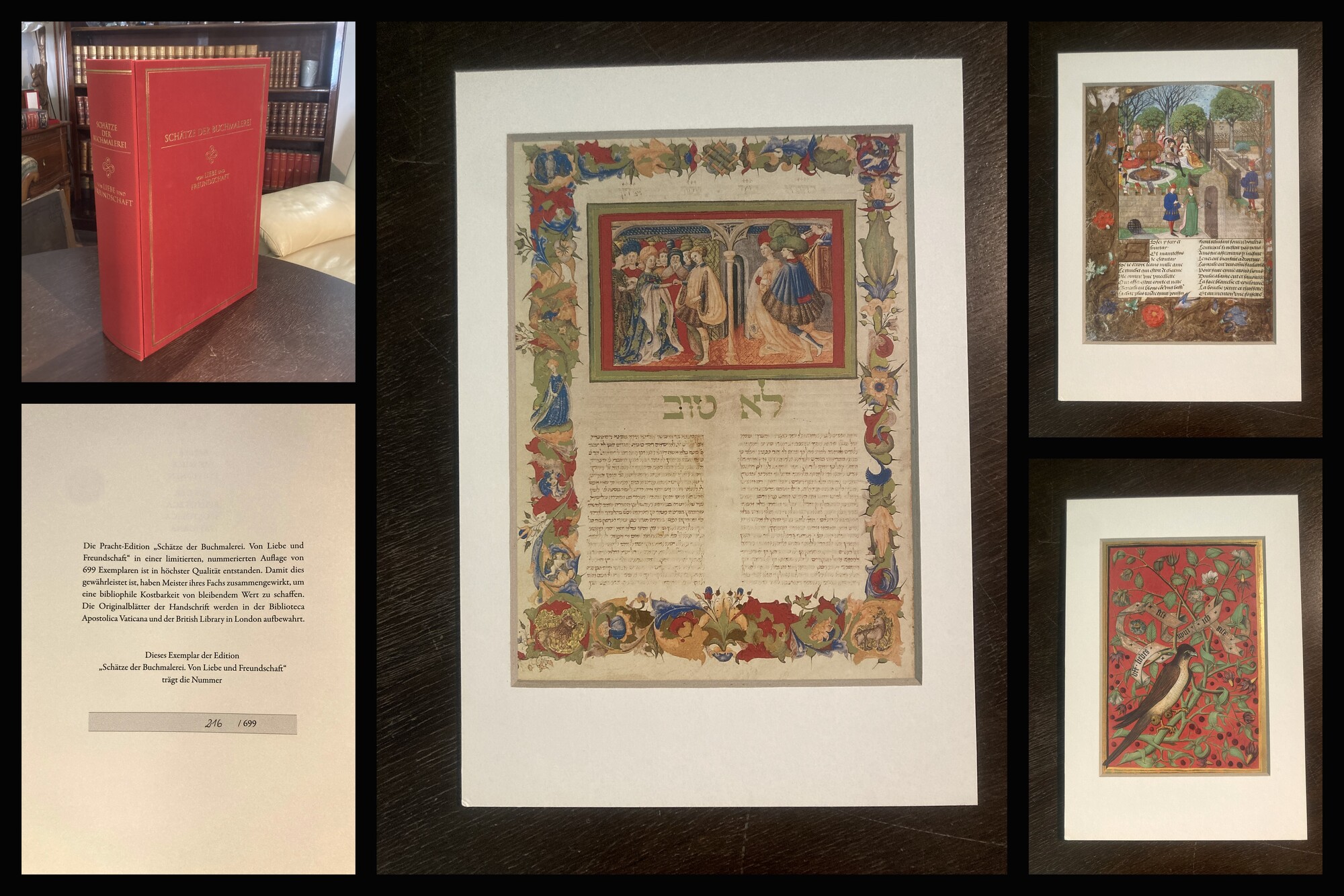 Faksimile-Werk. Schätze der Buchmalerei. Von Liebe und Freundschaft. Stuttgart, Belser, 2019. 2° (44 × 30 × 10 cm), mit 4 in Passepartout eingelegten farbigen Illustrationen von Miniaturen und Kommentarband 22 S. Roter Halblederband mit Rohseide überzogen, gold geprägter Vorderdeckel und Rückentitel. 1 von 699 nummerierten Exemplaren (GA). - Enthält die Miniatur zur Hochzeit des Pfalzgrafen Philipp mit Margareta von Bayern Landshut, Ciceros "Laelius de amicitia", das Hochzeitsbild aus der Handschrift Arba' ah Turim sowie die Illustration zum Rosenroman von Guillaume de Lorris und Jean de Meung. Kassette minimal angestaubt. Gesamt schönes Exemplar. Bestell-Nr: 25-0-19..........verkauft | ||