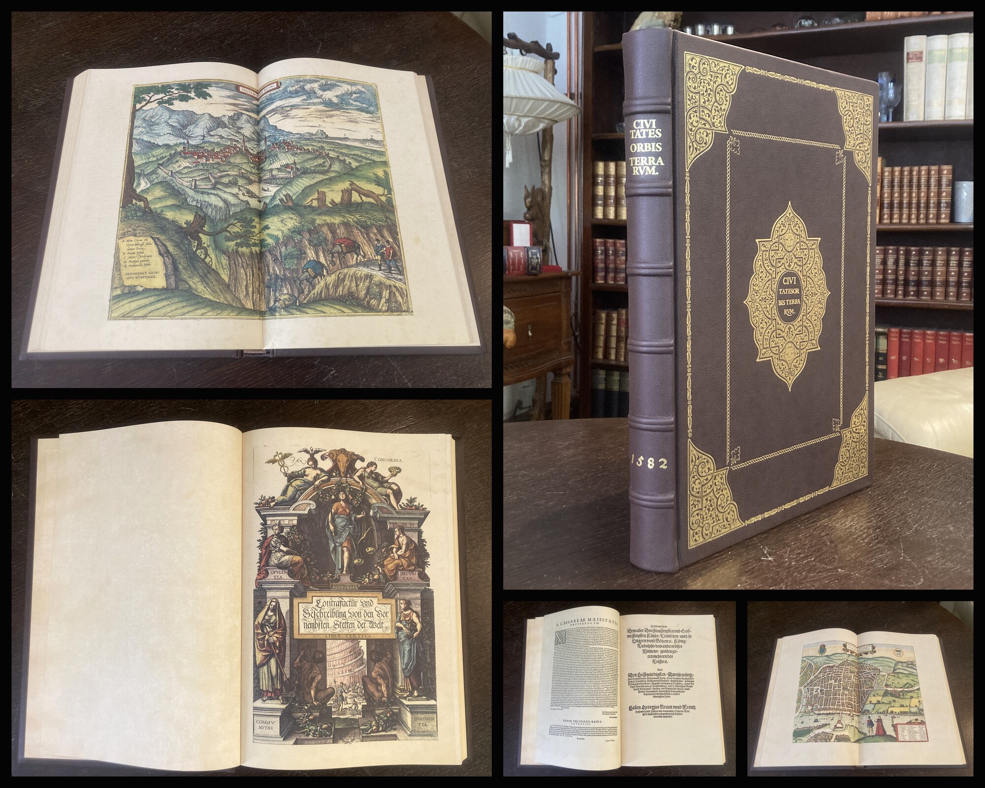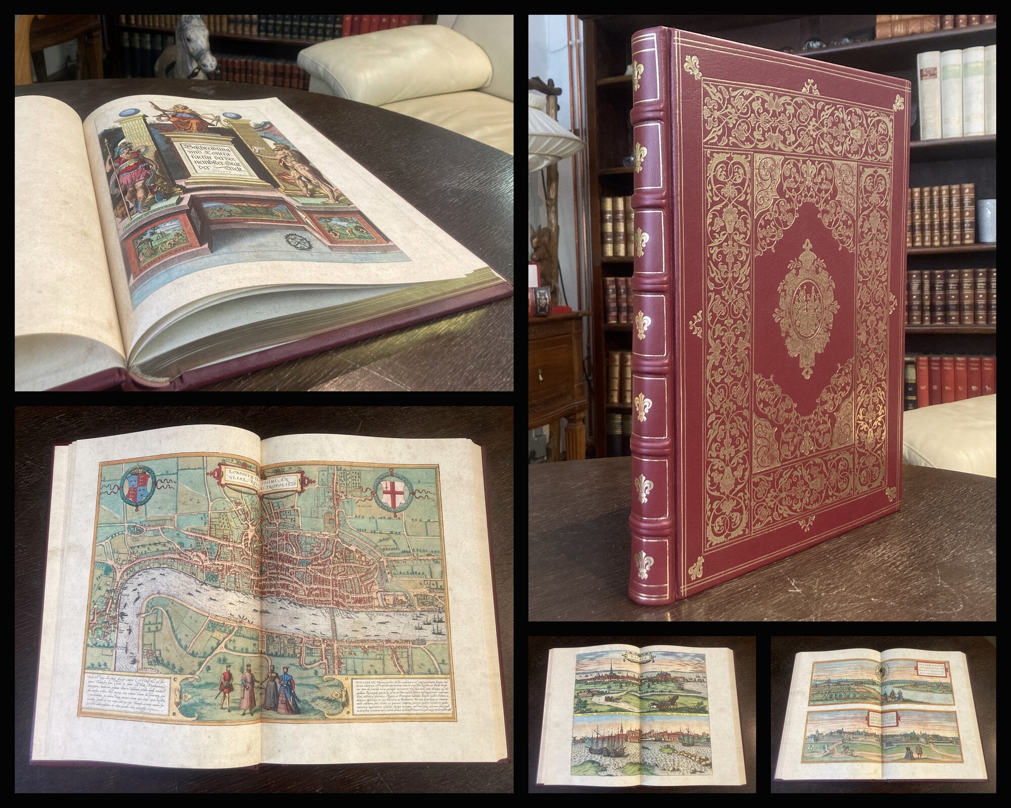 Braun, Georg / Hogenberg, Franz. Civitates Orbis Terrarum 1597 - Beschreibung und Contrafactur der vornembster Stät der Welt, das fünffte Buch - Faksimile des Städtebuches von 1597. Simmbach am Inn, Coron Verlag/ Müller & Schindler, 2022. gr. Folio (ca. 45 cm x 34 cm),(1), farbiger Titel, 7 nn. Bll., 69 doppelblattgroße farbige Karten, 4 nn. Bll, (1), brauner Ledereinband im Stil der Zeit mit reicher Goldprägung und Rundumgoldschnitt. Das Faksimile des Städtebuches mit den schönen, teils doppelblattgroßen Karten und Stadtansichten erschien in mehreren sich ergänzenden Ausgaben, hier vorliegend die Ausgabe von 1597. - Schöner Ledereinband mit umlaufendem Goldschnitt und üppiger Goldprägung auf Deckeln. Ohne erkennbare Gebrauchsspuren. Sehr gutes Exemplar . Bestell-Nr: 25-0-47..........verkauft | ||