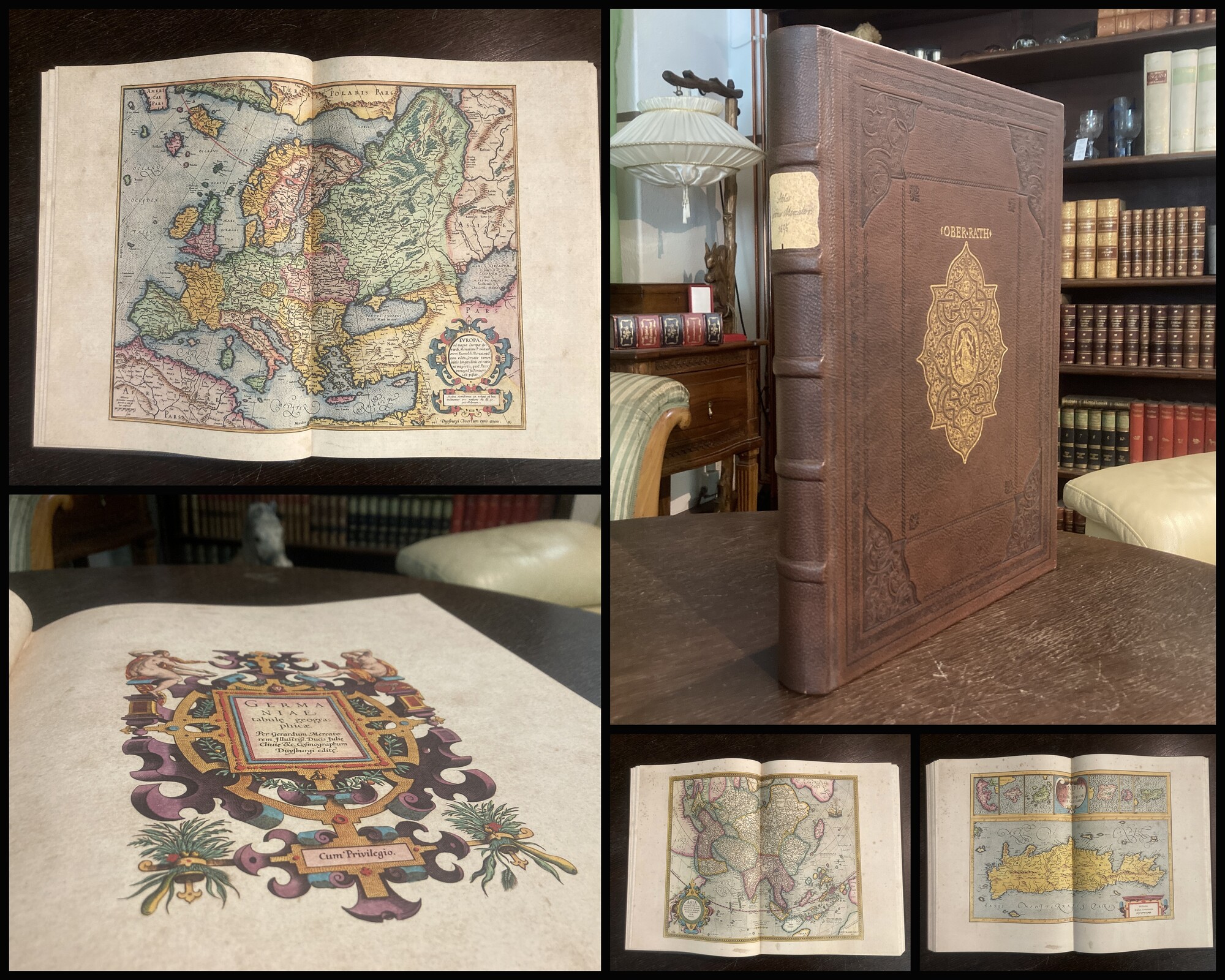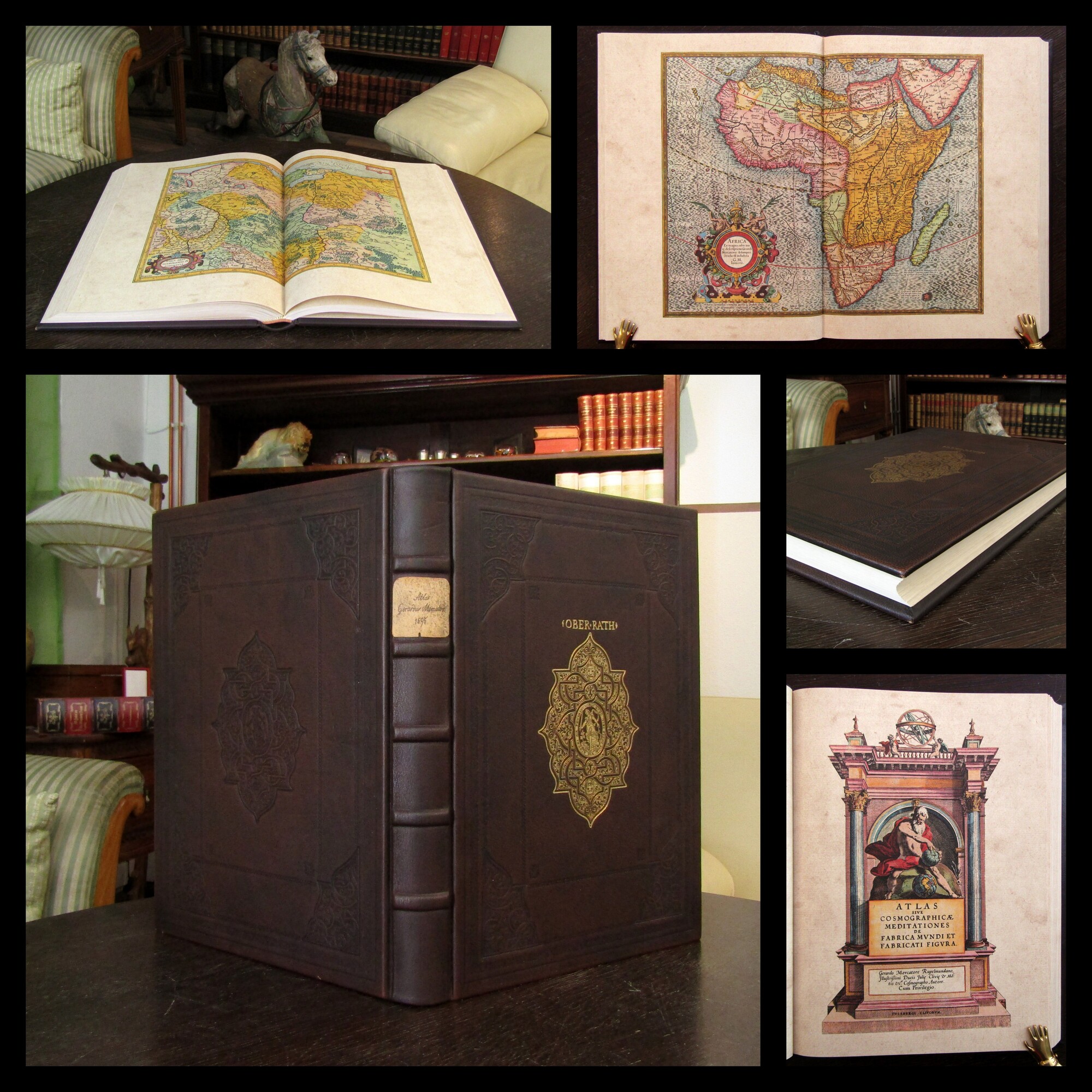 Mercator, Gerhard. Atlas sive Cosmographicae Meditationes de Fabrica Mundi et Fabricati Figura - Faksimile des Mercator Atlas von 1595 mit beigebundenem Begleittext. Berlin, Coron bei Kindler Verlag, 2010. gr. Folio (ca. 45 cm x 32,5 cm), mit koloriertem Titel + Zwischentitel, 57 doppelblattgroße, kolorierte Karten, 32 S.(Begleittext), brauner Ledereinband mit Gold- und Blindprägung. Das Faksimile des großen Atlas von Mercator mit den schönen, doppelblattgroßen Karten erschien im Original 1559 - Schöner Ledereinband mit Gold- und Blindprägung auf beiden Deckeln. Ohne erkennbare Gebrauchsspuren. Sehr gutes Exemplar. Bestell-Nr: 25-0-22..........verkauft | ||