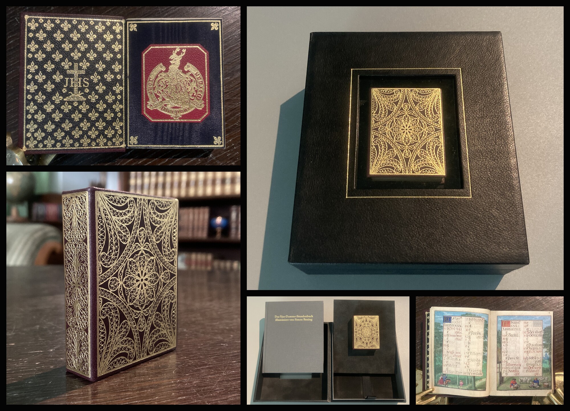 Wieck, Roger S. / Simon Bening (Illustrator). Das Van Damme-Stundenbuch illuminiert von Simon Bening. Faksimile der Handschrift MS M.451 der Pierpont Morgan Library, New York, USA. Mit Kommentarband von Roger S. Wieck. Gütersloh/München, Faksimile Verlag, 2013. 12° (7,5x6,5cm), mit 32 ganzseitigen Miniaturen mit 32 Initialseiten u. 12 reich verzierten Kalenderblättern, 2 Bll., 128 Bll., 4 Bll., schwarzer Ldr. mit dreis. Goldschnitt, allseitiger reicher Goldprägung, Innendeckel mit in goldgepr. Fileten gerahmten Fleurs de lille u. Kreuz mit "JHS" als Mittelstück, fliegenden Seidenmoiré-Vorsätzen mit goldgepr. Fileten u. Fleurs de Lille als Eckfleurons sowie 1 mont. goldgepr. Ldr.-Wappen-Exlibris in Ldr.-Kassette mit von einer Goldfilete umrahmten Sichtfenster. Eins von 882 nummer. Exemplaren. - Das Van Damme Stundenbuch entstand in Zusammenarbeit zwischen dem Schreiber Antonius van Damme (tätig 1495-1545) und dem (nicht namentlich genannten) flämischen Miniaturmaler Simon Bening (1483-1561) in Brügge. - Der 160-seitige Beiband in Leinen gebunden - Sehr gutes Exemplar. Bestell-Nr: 25-0-24..........verkauft |