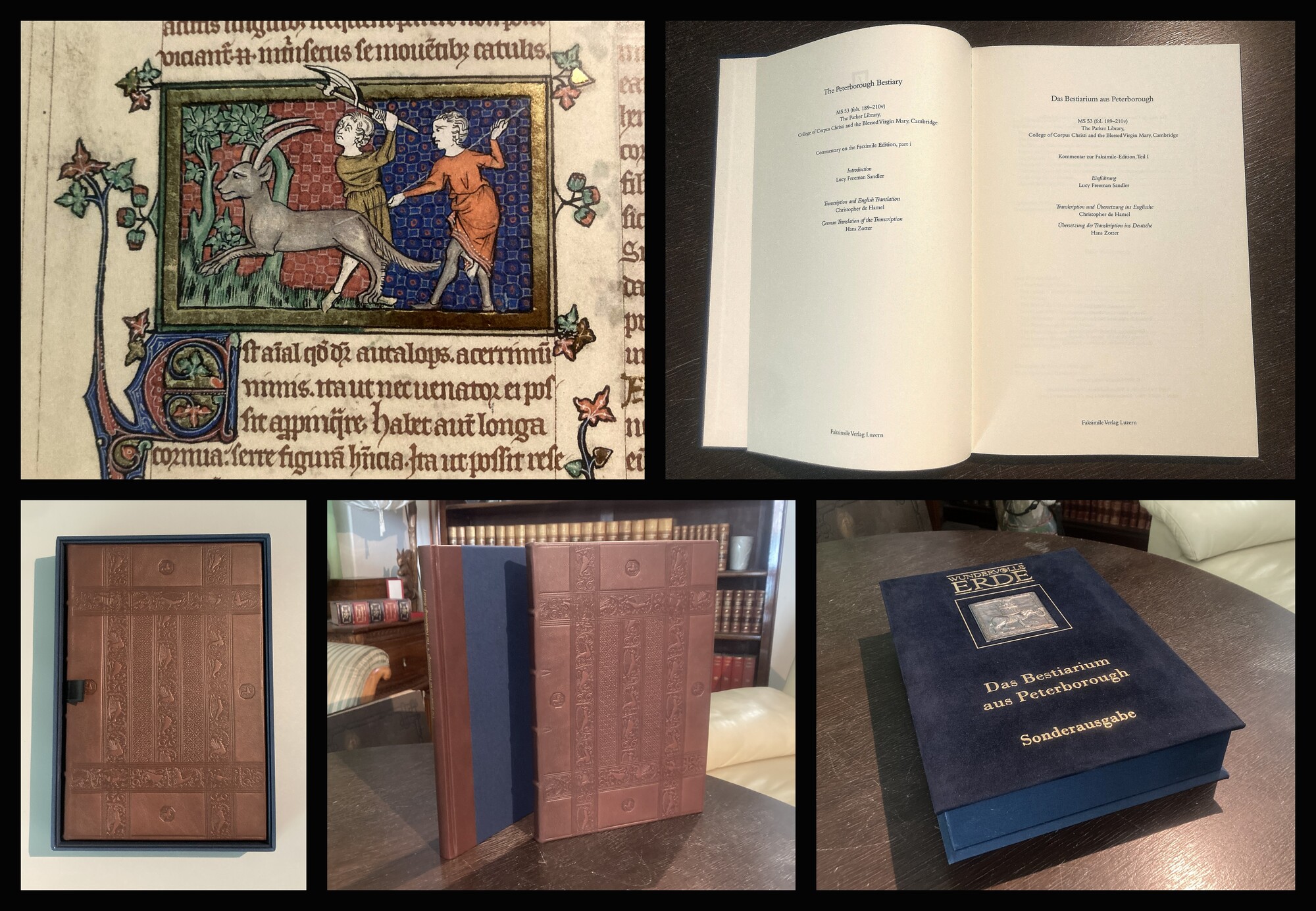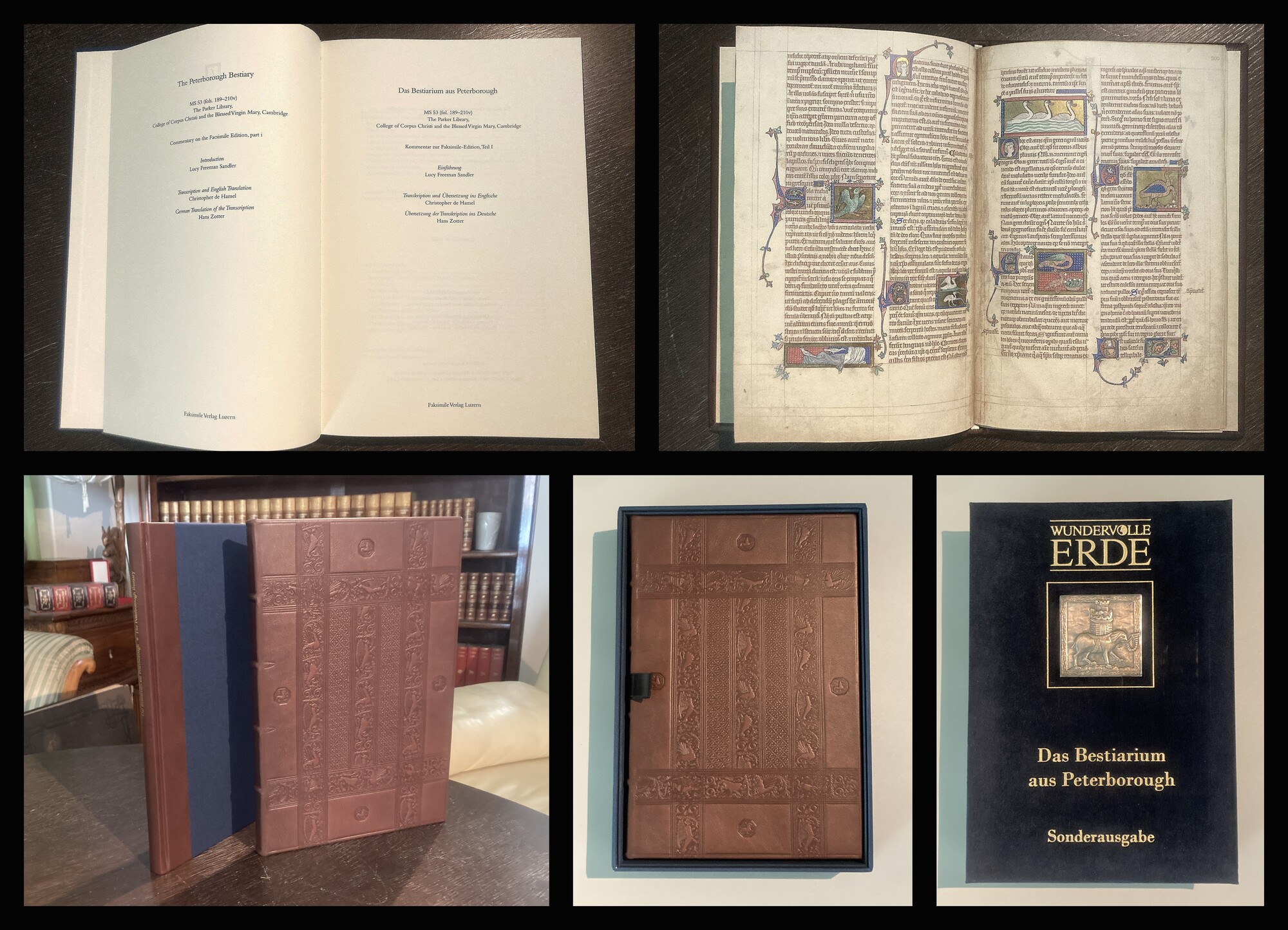 Sandler / Hamel / Zotter. Das Bestiarium aus Peterborough, The Peterborough Bestiary - Faksimile der Handschrift MS 53 der Parker Library des Corpus Christi College in Cambridge - mit dem Kommentarband von L. Freeman Sandler, Chr. de Hamel und H. Zotter. Luzern, Faksimile Verlag, 2003. Folio (36x25cm), mit 104 Farbminiaturen und 108 mit goldverzierten Initialen auf 44 vollfaksimilierten Seiten in Pergamentoptik, blindgepr, Ldr. in dunkelblauer original Leinwand und Samtkassette mit Metallapplikation auf vorderem Deckel. Eins von 700 arabisch nummer. Exemplaren. - Sehr gutes Exemplar. Bestell-Nr: 25-0-25..........verkauft | ||
