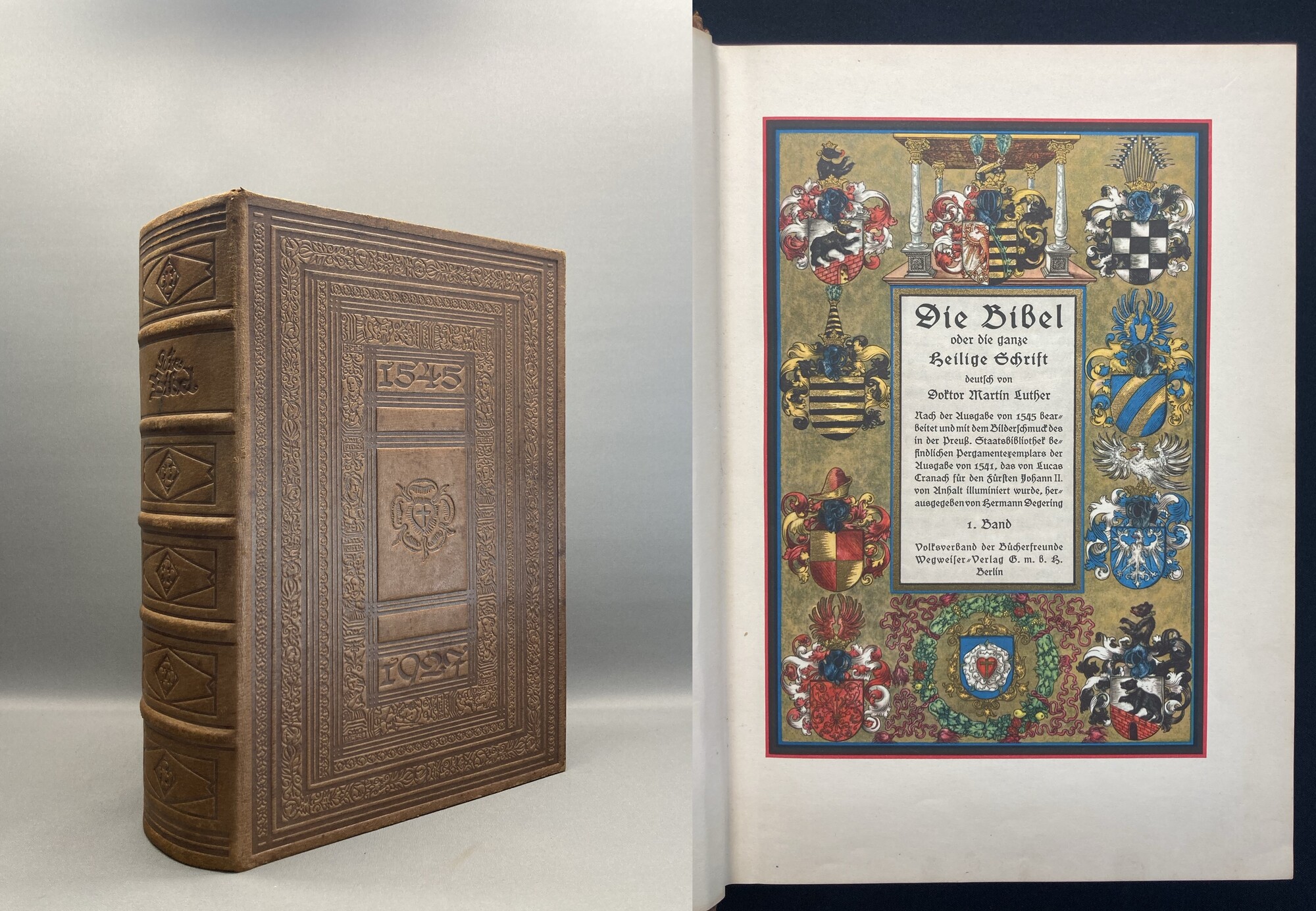 Luther, Dr. Martin. Die Bibel oder die ganze heilige Schrift deutsch von Doktor Martin Luther. Nach der Ausgabe von 1545 bearbeitet und mit dem Bilderschmuck des in der Preuß. Staatsbibliothek befindlichen Pergamentexemplars der Ausgabe von 1541, das von Lucas Cranach für den Fürsten Johann II. von Anhalt illuminiert wurde Herausgegeben von Hermann Degering. 1. Band. (alles erschienenene). Berlin, Volksverband der Bücherfreunde, Wegweiser Verlag, 1925. 4° (ca. 32 cm x 23 cm), mit 60 farbigen Illustrationen u. 50 farbigen Initialen 967 S., blindgeprägter Original Ledereinband im Stil des 16 Jahrhunderts. Dieses Werk wurde vom Volksverband der Bücherfreunde als Meisterdruck für seine Mitglieder hergestellt. Den Einband entwarf Kurt Siebert nach zeitgemäßen Motiven aus dem Besitz der Preußischen Staatsbibliothek in Berlin. Einband minimal berieben und leicht fleckig, Papier erste Seiten leicht fingerfleckig. Gesamt schönes imposantes und sammelwürdiges Exemplar. Bestell-Nr: 25-0-36..........verkauft | ||
