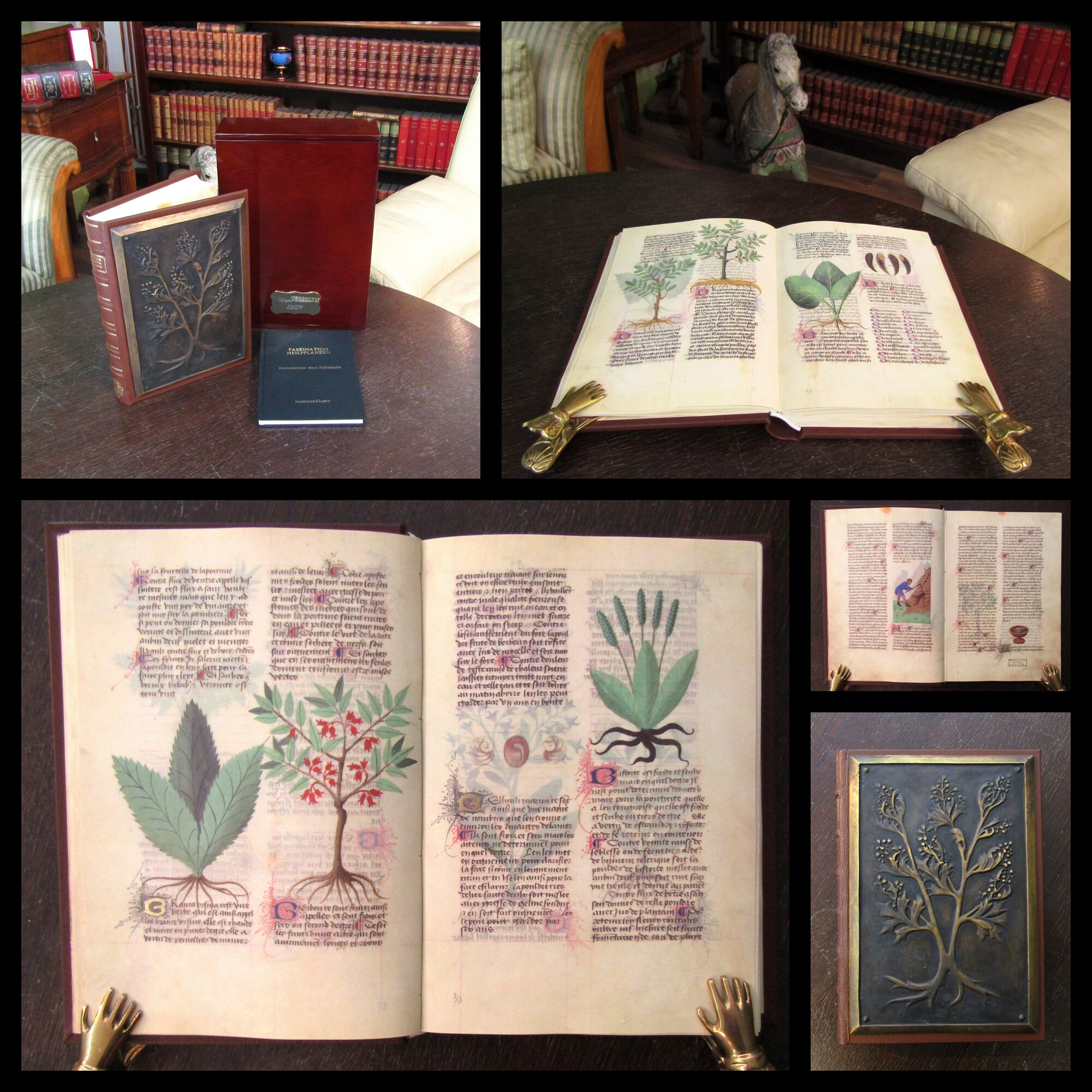 Platearius. Herbolaire (Grant Herbier). Faksimile der Handschrift Est. 28 = alfa M. 5.9 der Biblioteca Estense Universitaria di Modena.. o.O. und Gütersloh , Imago und Mediaexklusiv, o.J. / 2019. Kassette (ca. 34 cm x 24,5 cm), Faksimile (ca. 30 x 21 cm), Kommentar (ca. 21 cm x 15 cm), mit zahlreichen Abb. 170 Bll., 134 S. Genarbtes braunes Leder auf 6 Zierbünden mit goldgepr. RTitel, RVerg. u. schwerer antikisierender Bronzeplatte auf Vorderdeckel u. OLwd. mit goldgepr. DTitel in lackierte Holzschatulle. . Auf 299 Exemplare limetiert dieses trägt die Nr.22. Faksimile der französischen Übersetzung aus der 2. Hälfte des 15. Jh. der berühmten Schrift "De simplicibus medicinis" des Mediziners Matthaeus Platerarius. Gesamt sehr Schönes Exemplar. Bestell-Nr: 25-0-38..........zurückgestellt | ||