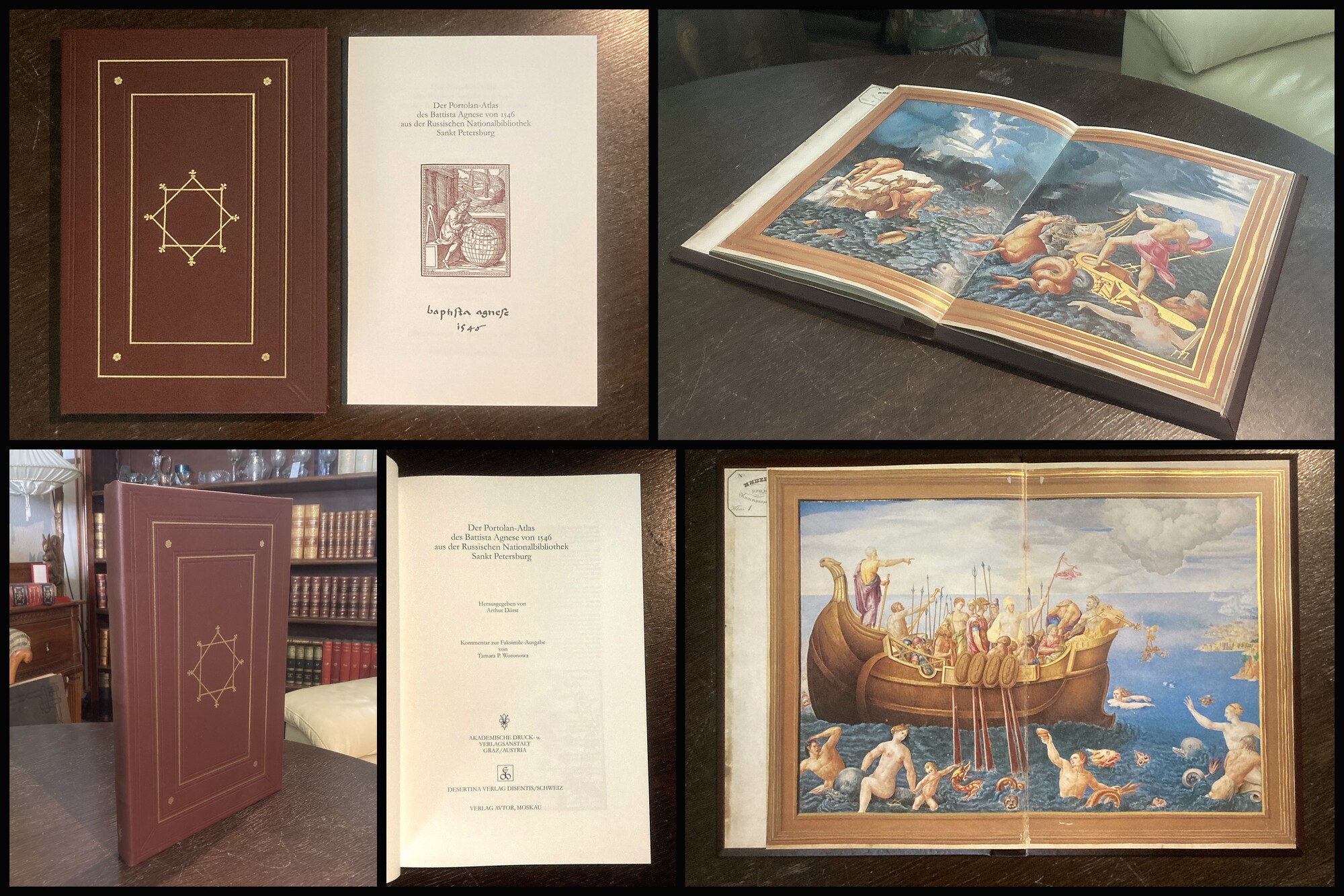Dürst, Arthur. Portolan-Atlas von Battista Agnese von 1546 aus der Russischen Nationalbibliothek Sankt Petersburg. Faks. und Kommentar. Graz, Akadem. Druck- u. Verlags Anstalt, 1993. Folio (38 cm x 26 cm), Faksimile mit 20 nn Bll., 32 S. (Kommentarband), blind- u. goldgepr. OLdr. (Faks.). Eins von 700 Exemplaren. Portolan-Atlas von Battista Agnese von 1546 aus der Russischen Nationalbibliothek Sankt Petersburg. Faks. und Kommentar. Gesamt gutes Exemplar. Bestell-Nr: 25-0-4..........verkauft | ||