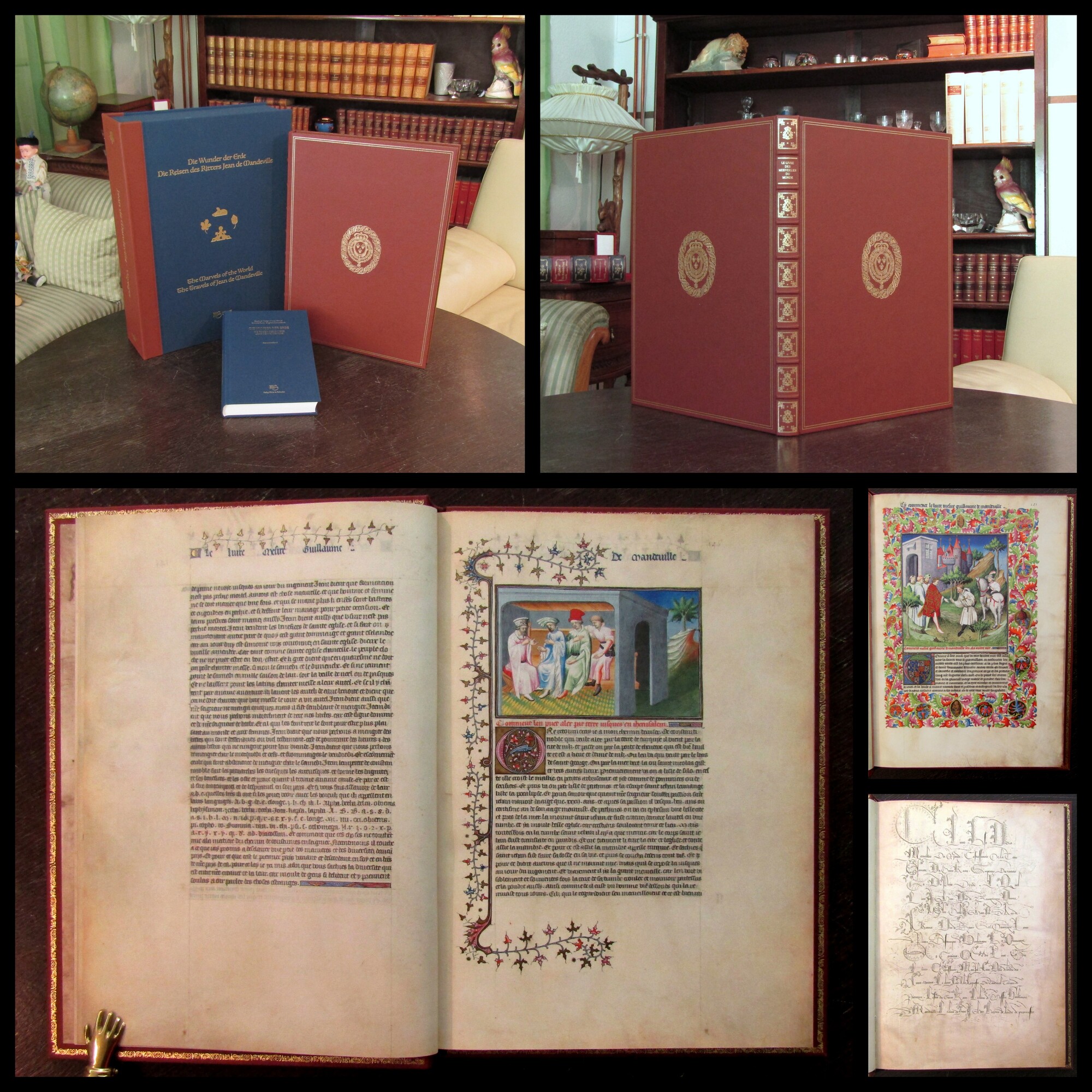 Faksimile. Die Wunder der Erde. Die Reisen des Ritters Jean De Mandeville (Livre des merveilles, FR 2810, Folios 141-225). Simbach u. Madirid, Müller u. Schindler u. Eikon Editors, 2017. Kassette ca. 48 cm x 34 cm, Faksimle ca. 44 cm x 32 cm, Kommentar ca.24,5 cm x 17,5 cm, Faksimile 1 Bl. , Bll. 141-225, Kommentar 447 S., Kommentar Leinen, Faksimile goldgrprägter Ledereinband in Halbleder-Kassette. Eines von 900 nummerierten Exemplaren hier die Nr. 747. - Zwischen Januar 1410 und spätestens Ende 1412 in Paris entstand mit der Handschrift um die Abenteuer des Ritters Jean de Mandeville einer der beliebtesten Reiseberichte des Mittelalters. Die berühmtesten und talentiertesten Buchmaler wie der Mazarine-, der Cite-des-dames- und der Egerton-Meister arbeiteten zusammen. Es entstand ein Reisebericht, der buchstäblich prachtvoll ist. Der vermeintliche Autor nennt sich im Text selbst: Jean de Mandeville, ein englischer Ritter, der 1322 aufbrach und erst 1356 in seine Heimat zurückgekehrt sei, nachdem er dreissig Jahre lang nahezu alle Länder der Welt durchreist habe. Die Darstellungen reichen von verehrungswürdigen Stätten im Heiligen Land bis zu exotischen Szenerien im Fernen Osten. In vollendeter Kunstfertigkeit zeigen 74 strahlende Miniaturen Motive aus diesen Abenteuern. Sehr guter Zustand, nahezu verlagsfrisches Exemplar. . Bestell-Nr: 25-0-43..........zurückgestellt | ||