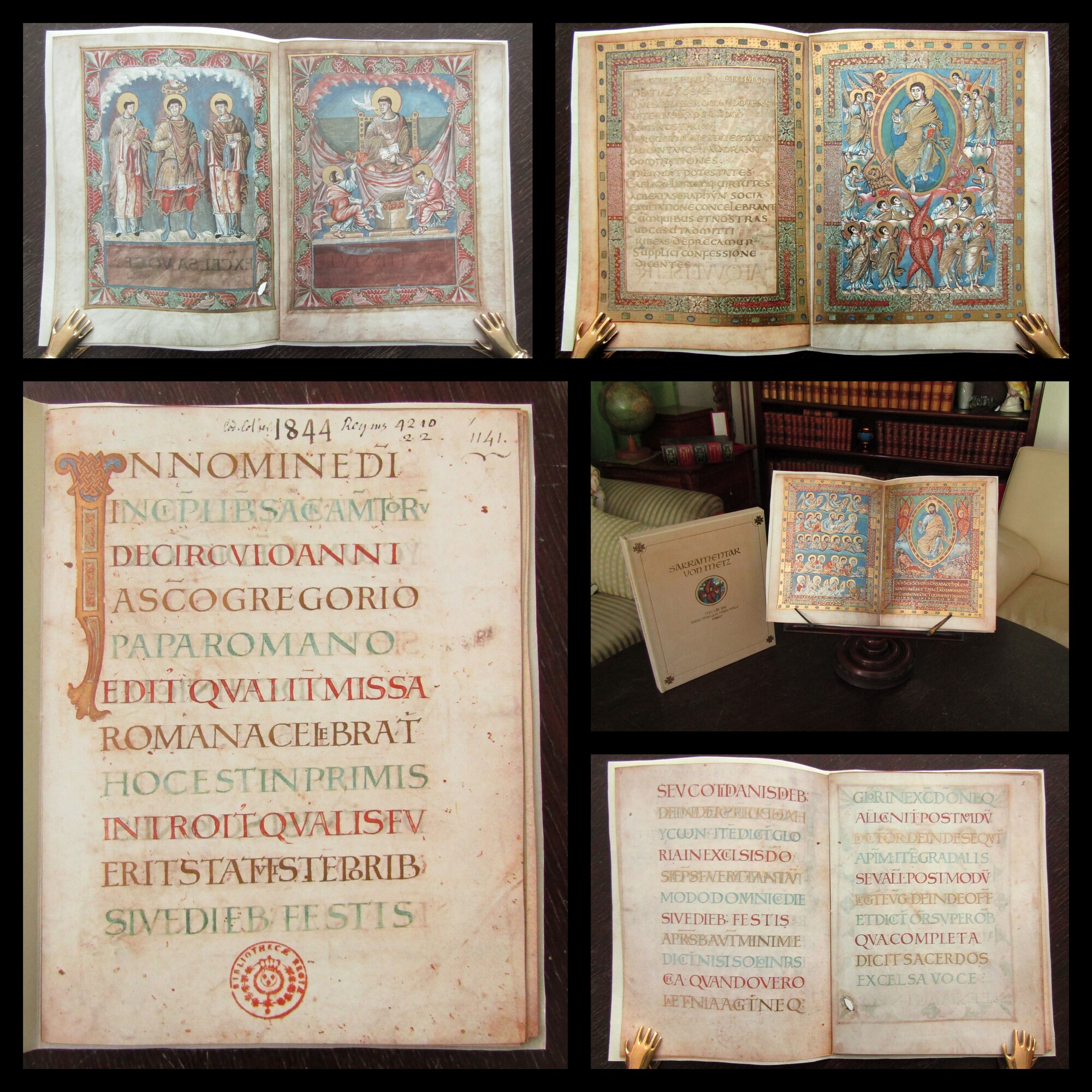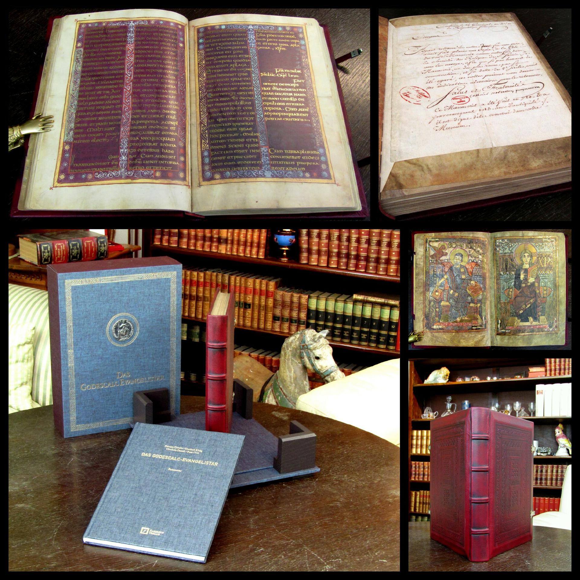 Faksimile. Das Godescalc Evangelistar. Originalgetreue Faksimile Ausgabe der Bilderhandschrift Ms.Nouv.Acq.Lat. 1203 der Bibliothèque nationale de France, Paris. 2 Bde. , , . 30,7 cm x 20, 8 cm (Faksimile), 29 cm x 22 cm (Kommentar), 37,7 cm x 28,3 cm (Kassette), Faksimile 2 nn. Bll., 127 Bll, 2 nn. Bll. Blindgepr. Ledereinband mit Metallschliessen. Orig.Leinen (Komment.). Zusammen in Orig.Leien-Kassette mit montierter Replik einer Münze. Nr. 325 von 980 Ex. (GA 1040) in arabischer Nummerierung. - Kommentar von F. Crivello, E. Konig, C. Denoel u. P. Orth. Mit einem Geleitwort von F. Mutherich. Das Godescalc-Evangelistar wurde zwischen 781 und 783 im Auftrag von Karl dem Grossen und seiner Gemahlin Hildegard angefertigt. Es enthalt vier Evangelistenbilder, eine Christusdarstellung und das Motiv eines Lebensbrunnens, das erstmals in einem Evangelistar erscheint. Der Schreiber der Handschrift, Godescalc, begleitete Karl den Grossen auf seiner Reise nach Rom im Jahr 780/781 und verewigte den Italienzug in einem Widmungsgedicht. Die Handschrift entstand im Skriptorium der Hofschule Karls des Grossen in Aachen und zeigt stilistisch deutliche Elemente der insularen Buchmalerei. Sie gilt als das früheste bekannte Manuskript aus dieser Schule und ist eine der kostbarsten Handschriften aus der karolingischen Zeit. Bestell-Nr: 25-0-44..........verkauft | ||