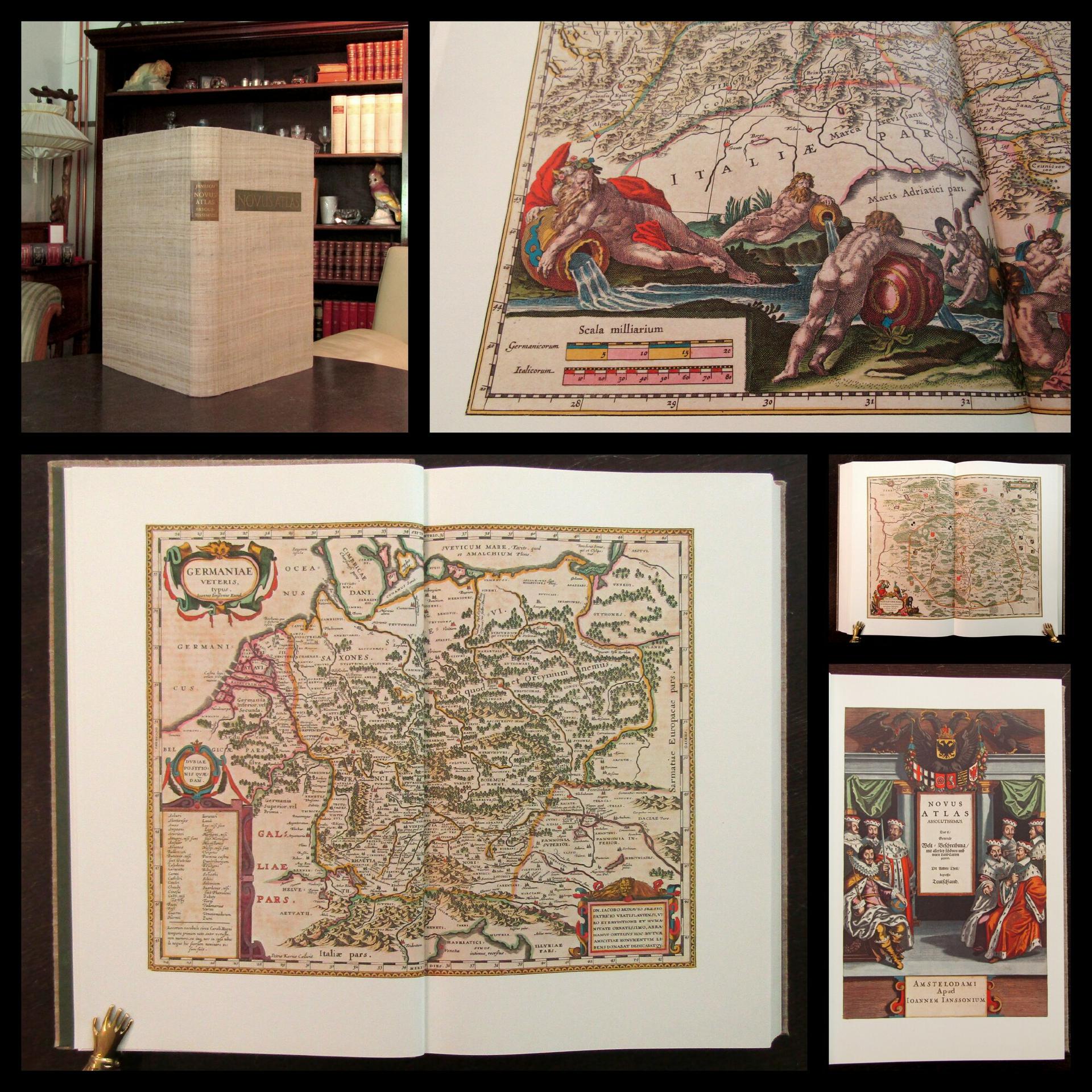Joannes Jansson . Novus Atlas Absolutissmus - Ausgabe A - 1657/70. München, Faksimileverlag Battenberg, 1977. ca. 50 cm x 32 cm- - 92 doppelblattgrosse Karten- Exemplar der Ausgabe A im Endi Silk-Einband (von Hand gesponnene und gewebte Seide aus Assam) goldgeprägte Deckel- und Rückenschilder aus Leder. Grüne Vorsätze. Novus Atlas Absolutissimus: Das ist generale Welt-Beschreibung mit allerley schönen und neuen Land-Carten gezieret. Der andere Theil begreiffet Teutschland. Vollständiges Faksimile der 92 Karten nach dem Exemplar 2° Mapp 80-2 der Bayerischen Staatsbibliothek München. Vorwort von Traudl Seifert. Faksimile [d. Ausg.] Amsterdam, Jansson, 1657/70. 1ne Seite beschädigt.. Bestell-Nr: 25-0-48..........verkauft | ||