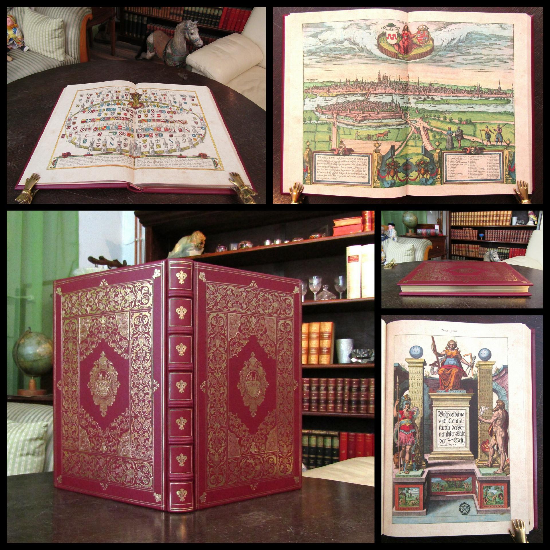 Braun, Georg / Hogenberg, Franz. Civitates Orbis Terrarum 1574 - Beschreibung und Contrafactur der vornembster Stät der Welt - Faksimile des Städtebuches von 1574 mit Begleitheft/Kommentarband von Max Schefold. Simmbach am Inn, Coron Verlag/ Müller & Schindler, 2014. gr. Folio (ca. 45 cm x 34 cm), farbiger Titel, 3 nn. Bll., 59 doppelblattgroße farbige Karten, 6 nn. Bll., brauner Ledereinband im Stil der Zeit mit reicher Goldprägung und Rundumgoldschnitt. Das Faksimile des Städtebuches mit den schönen, teils doppelblattgroßen Karten und Stadtansichten erschien in mehreren sich ergänzenden Ausgaben, hier vorliegend die Ausgabe von 1574. - Schöner Ledereinband mit umlaufendem Goldschnitt und üppiger Goldprägung auf Deckeln. Ohne erkennbare Gebrauchsspuren. Sehr gutes Exemplar . Bestell-Nr: 25-0-6..........verkauft | ||