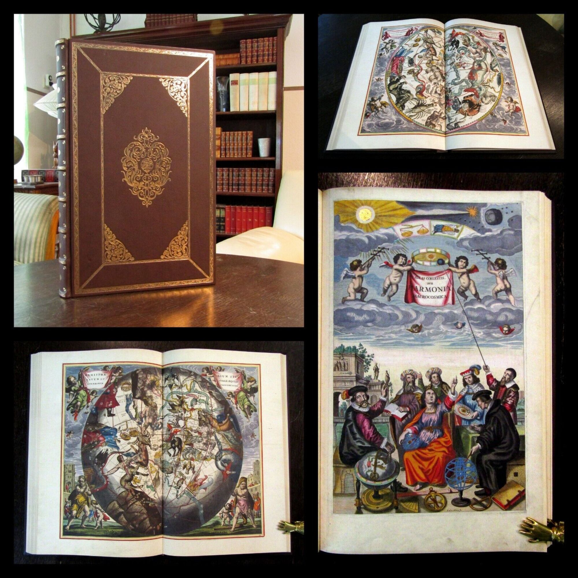 Cellarius, Andreas [Andreas Keller]. Harmonia Macrocosmica, seu Atlas universalis, totius universi creati cosmographiam generalem, et novam exhibens [...] - Faksimile des Himmelsatlas von 1661 mit angebundenem Kommentar von Jürgen Hamel. Berlin, Coron, Kindler verlag, 2008. gr. Folio (ca. 51 cm x 32 cm), mit koloriertem, goldgehöhtem Titel, 29 doppelblattgroße, kolorierte Himmelskarten, 7 nn Bll., (Vorrede), 39(1) S., brauner Ledereinband mit reicher Goldprägung und ziseliertem Rundumgoldschnitt. Das Faksimile des großen Himmelsatlas von Cellarius mit den schönen, doppelblattgroßen Himmelskarten erschien im Original 1661 - Schöner Ledereinband mit umlaufendem, gepunzten Goldschnitt und üppiger Goldprägung auf beiden Deckeln. Ohne erkennbare Gebrauchsspuren. Sehr gutes Exemplar. Bestell-Nr: 25-0-7..........verkauft | ||