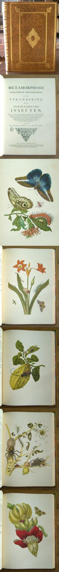 Merian, Maria Sibylla. Methamorphosis Insectorum Surinamensium of te Verandering der Surinaamsche Insecten. Waar in de Surinaamsche Rupfen [...]. Amsterdam / Leipzig, Gerard Valck / Insel Verlag, 1705 / 1975. gr. Folio, mit 60 Farbtafeln, 3 nn. Bll., 60 S., 1 nn. Bl., OLdr. Nr. 209/600 Ex. der VA in Ganzleder. Sehr dekoratives, hervorragend erhaltenes Exemplar in Leinenschuber mit begleitendem Textband. Bestell-Nr: 25-0-29..........verkauft | ||